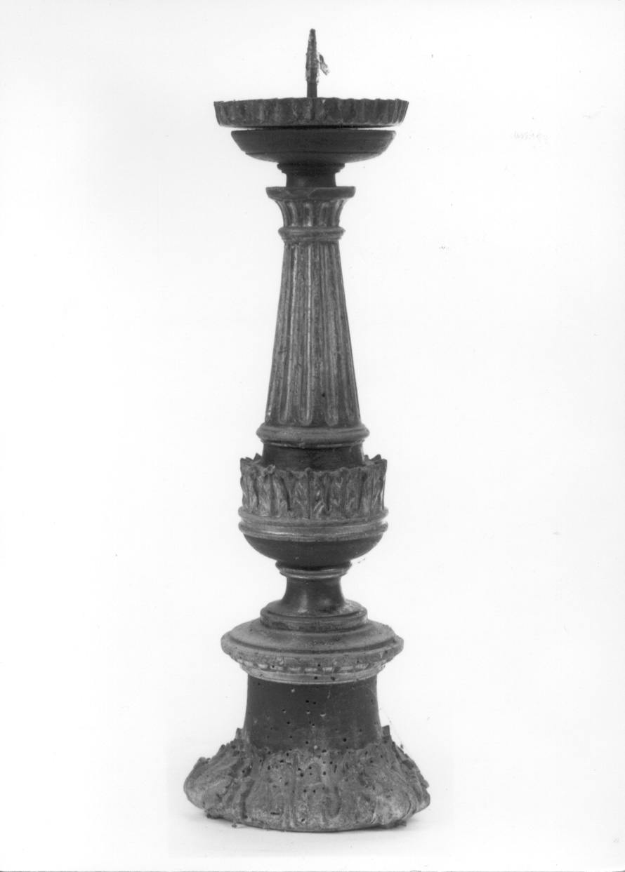 Candeliere a base circolare su piedi leonini con corolla di foglie lanceolate e fusto a balaustro con giro di foglie d'acanto, rastremato e scanalato nella parte terminale