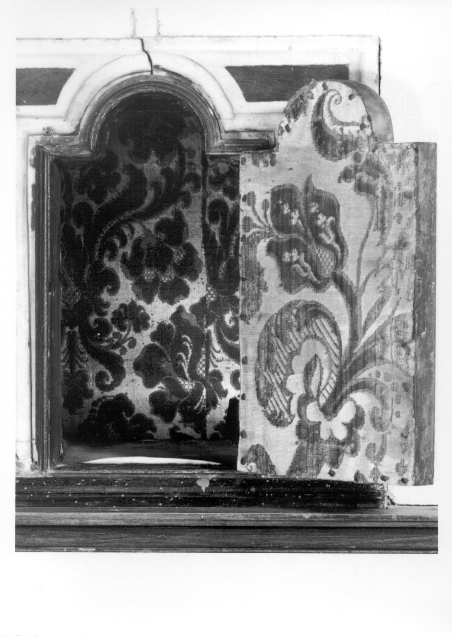 Tabernacolo a muro con cornice quadrangolare in marmo bianco, rosso e verde, sormontata da croce e dotata di luce con coronamento centinato. Zoccolo in legno di noce; interno foderato in tela di filo metallico con applicazioni in velluto a fiori rosa