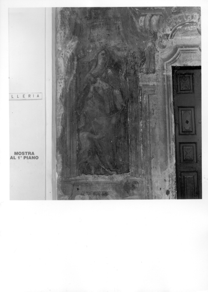 Al centro di una finta nicchia, è disposta questa figura femminile, realizzata a monocromo, a figura intera, mentre sostiene con un braccio un bambino, mentre un altro bimbo, un po' più grandicello e reggente una croce, è alla sua destra
