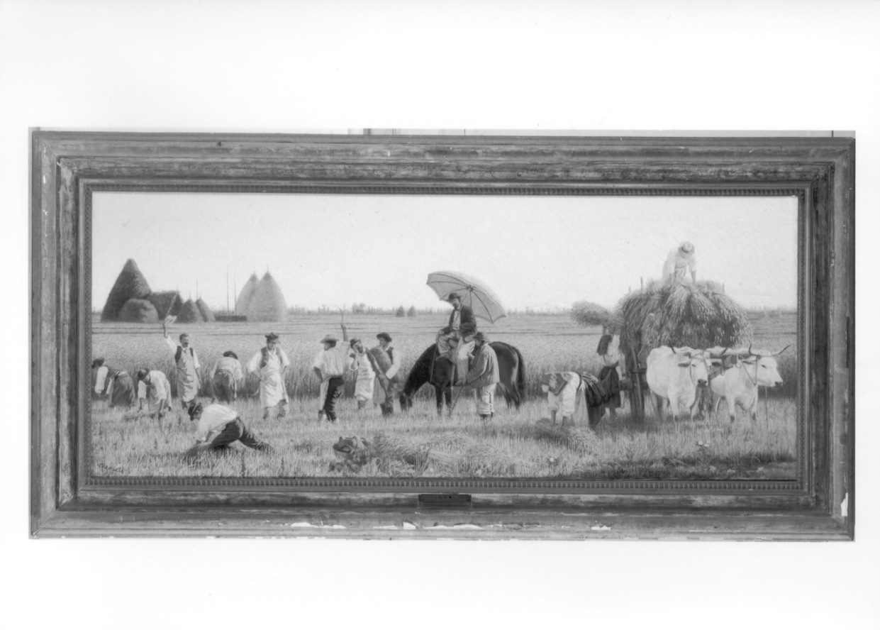 La scena è ambientata in un campo di grano al tempo della mietitura; sullo sfondo si stagliano dei covoni, mentre in primo piano, a destra, c'è un carro trainato da due buoi su cui un uomo ed una donna stanno sistemando delle fascine di grano. Al centro della scena è dipinto un uomo a cavallo che si ripara dal sole con un grande ombrello; accanto, altri uomini suonano la cornamusa ed agitano in aria cappelli e falcetti, mentre altre persone sono chine a terra, intente alla mietitura. Cornice in legno intagliato e dorato