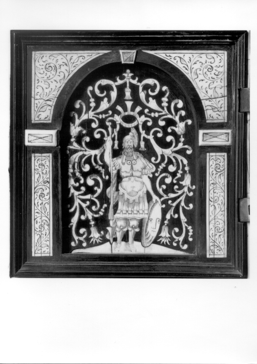 Sportello di forma quadrata con placchette in avorio intarsiato con motivi a girali vegetali, che incorniciano una nicchia centrale in cui è rappresentato un guerriero con baffi e lunga barba con armatura all'antica, elmo con pennacchio sul lato sinistro, calzari alti. Con la mano destra afferra la lancia, tenuta in posizione verticale, mentre con la sinistra tiene lo scudo su cui è l'immagine del sole. Sfondo scuro decorato da girali e fiori