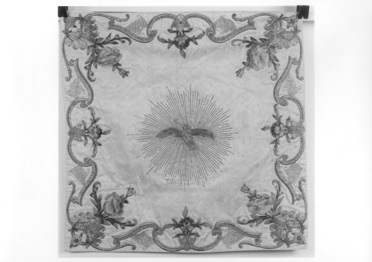 Il velo è eseguito con un pannello di taffetas liseré ricamato ricamato in oro filato e lamellare, argento filato e seta policroma (gialla, rossa, rosa, viola, blu, azzurra, celeste, verde e nera). Al centro, circondata da raggi, è posta la colomba in argento, inserita entro una cornice mistilinea, formata da volute e girali dorate che reggono fiori policromi. E' foderata con un pannello di diagonale di cotone bianco