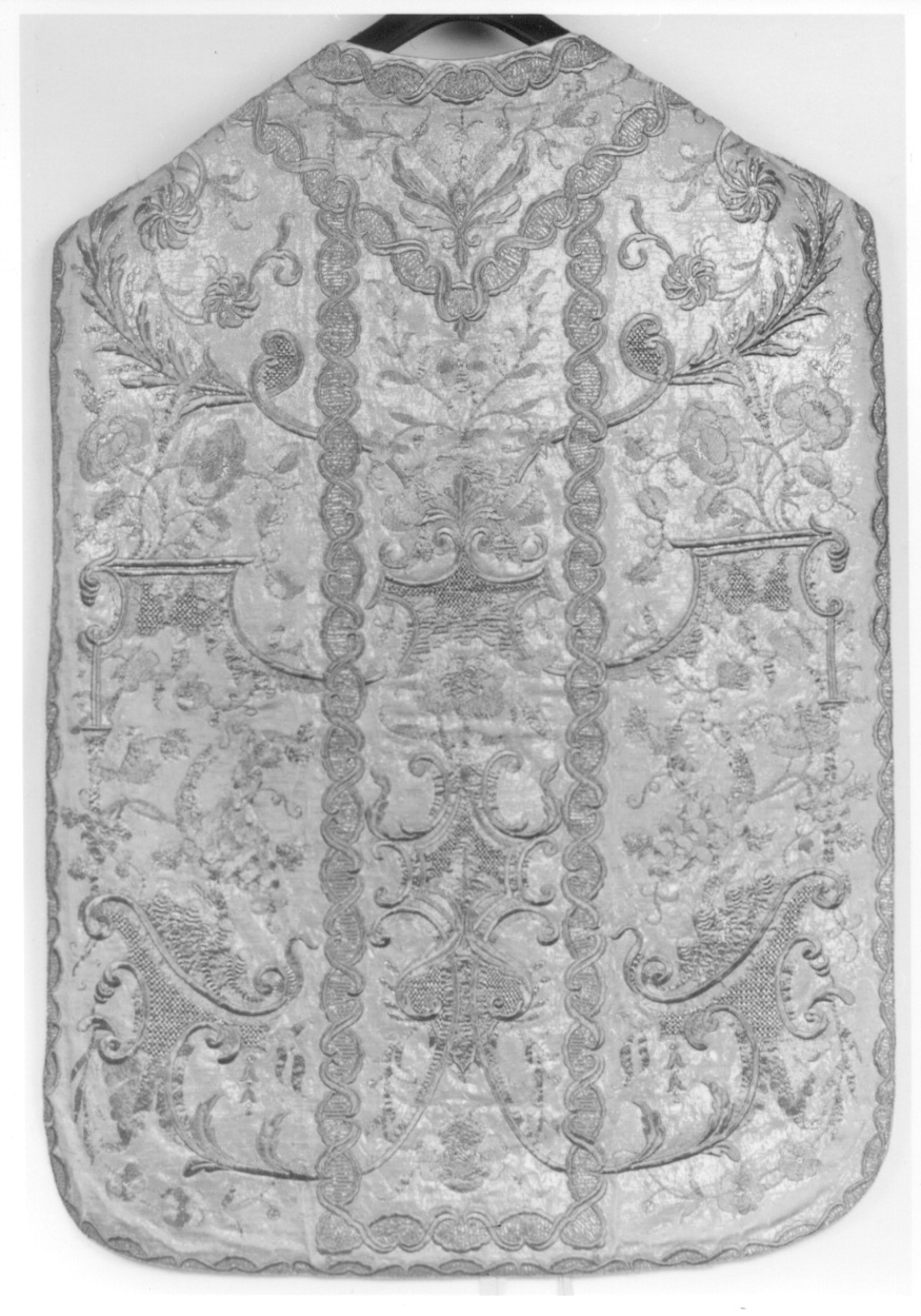 - NOTIZIE STORICO CRITICHE Il ricamo, pur rifacendosi a modelli settecenteschi ( M. VILLOTTA (a cura di), I paramenti sacri tra storia e tutela, Tavagnacco 1996, pp. 70-71, scheda n. 13 di M. B. Bertone; A. BARBERIS (a cura di), Il corredo tessile, in Argenti, oggetti e paramenti del Duomo di Valenza, Torino 1991, p. 65, scheda n. 10), è ascrivibile alla seconda metà del XIX secolo, come sembrano suggerire alcune rigidita del disegno e la composizione sontuosa, ma appesantita. La ripresa di decori dei secoli passati è testimoniata da molteplici manufatti, quali la pianeta del 1860 della Cattedrale di Ales (M. G. MESSINA e A. PASOLINI (a cura di), Paramenti sacri. Tessuti serici del Duomo di Ales dal '600 al '900, catalogo della mostra di Ales, Cagliari 1998, p. 43, scheda n. 35 di A. Pasolini), il parato del XIX secolo di Santa Maria della Steccata a Parma (L. FORNARI SCHIANCHI (a cura di), "Per uso del santificare et adornare". Gli arredi di Santa Maria della Steccata. Argenti/ Tessuti, catalogo della mostra, Parma 1991, pp. 218-219, scheda n. 135 di M. Cuoghi Costantini),e le pianete, datate a cavallo fra Otto e Novecento del Museo Diocesano di Trento (D. DEVOTI, D. DIGILIO e D. PRIMERANO (a cura di), Vesti liturgiche e frammenti tessili nella raccolta del Museo Diocesano Tridentino, Trento 1999, pp. 202-203, schede nn. 164-165 di D. Digilio)