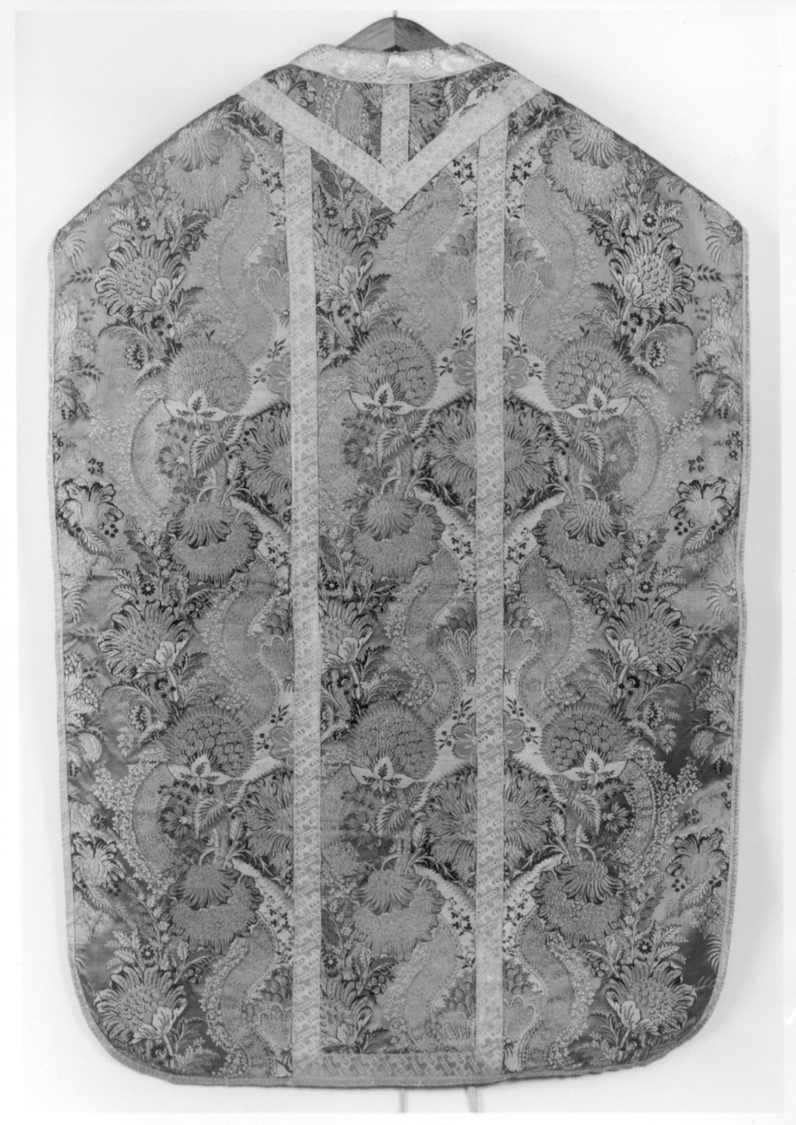 - NOTIZIE STORICO CRITICHE Il decoro del lampasso è ancora strettamente legato al motivo "a pizzo", nei decenni a cavallo fra il Sei ed il Settecento, come si evince dal confronto con alcune testimonianze giunte fino ai nostri giorni, come ad esempio il frammento in lampasso liseré lanciato e broccato dell'Abegg, datato al primo terzo del secolo ed ascritto alla Francia (A. GRUBER, Das Spitzenmuster im 18. Jahrhundert Les motifs à dentelle au XVIII° siècle, catalogo della mostra di Riggisberg, Berna 1979, p. 13, scheda n. 6), il parato, in lampasso liseré broccato, datato al 17209-1730, conservato presso Notre-Dome des Doms di Avignone ( Merveilles d'or & de soie. Trésors textiles de Notre-Dame des Doms du XVI au XIX siècle, catalogo della mostra, Avignone 2000, p. 65, scheda n. 49 di E. Dutocq e O. Valansot) e la pianeta, in lampasso liseré lanciato e broccato, ascritto ad una manifattura veneta e datato al primo quarto del Settecento del Museo Diocesano Tridentino (D. DEVOTI, D. DIGILIO e D. PRIMERANO (a cura di), Vesti liturgiche e frammenti tessili nella raccolta del Museo Diocesano Tridentino, trento 1999, pp. 90, scheda n. 42 di D. Digilio ). Rispetto a queste testimonianze, però, nella struttura decorativa del tessuto vercellese i motivi floreali assumomo una maggiore importanza e sono raffigurati con un maggior naturalismo, secondo un gusto che si diffonde a partire dagli anni 30 e che sfocierà nella tecnica, ideata da Jean Revel, del "point rentré" (C. BUSS, Seta oro e argento. Le sete operate del XVIII secolo, Milano 1992, p. 53). Una datazione al quarto decennio del Settecento appare confermata dal confronto con testimonianze coeve, quali il frammento di broccato lampasso, attribuito a manifatture italiane o francesi e dararo al 1720-1735, della collezione Keir (M. KING e D. KING, European Textiles in the Keir Collection 400 BC to 1800AD, Londra-Boston 1990, p. 268, scheda n. 207), il lampasso lanciato e broccato, datato al 1730-1740 e attribuito a manifatture francesi o veneziane, impiegato per realizzare una parato conservato nella pieve di S. Maria Assunta a Gemona (M. VILLOTTA (a cura di), I paramenti sacri tra storia e tutela, Tavagnacco 1996, pp. 124-125, scheda n. 39 di M. Villotta), alcuni frammenti di lampassi liseré, lanciati e broccati, attribuiti alla Francia e datati al quatro decennio del Settecento, conservati presso il Kunstgewerbemuseum di Monaco (B. MARKOWSKY, Europäische Seidengewebe des 13.-18. Jahrhunderts, Colonia 1976, p. 310, schede n 526-527 e p. 313, scheda n. 534), la pianeta in damasco broccato, attribuito all'Italia o alla Francia e datato al secondo quarto del Settecento, della Basilica del santo a Padova (D. DAVANZO POLI (a cura di), Basilica del Santo. I tessuti,Roma 1995, (pp. 100-102, scheda n. 61) il frammento, ascritto a Venezia e datato al 1730 circa, conservato presso il Museo del Tessuto di Prato (R. BONITO FANELLI, Five centuries of italian textiles. A selection from the Museo del Tessuto Prato, catalogo della mostra, Prato 1981, p. 270, n. 81), i teli in broccatello, di ambito italiano e collocato alla fine del primo terzo del secolo, del Museo Civico di Treviso ( D. DAVANZO POLI (a cura di) , Tessuti Antichi. Tessuti - Abbigliamento - Merletti - Ricami Secoli XIV-XIX, catalogo della mostra, Treviso 1994, p. 74, scheda n. 91).un frammento di lampasso liseré broccato, ascritto alla francia e datato al 1725-1730, della collezione Gandini (D. DEVOTI, G. GUANDALINI, E. BAZZANI, M. CUOGHI COSTANTINI e I. SILVESTRI, La collezione Gandini del Museo Civico di Modena. I tessuti del XVIII e XIX secolo, Bologna 1985, pp. 151-152, scheda n. 39) e, infine con il lampasso liseré e broccato, attribuito ad una manifattura francese e datato al 1735, impiegato per confezionare un parato per la chiesa parrocchiale di Aulin (C. ARIBAUD, Soieries en Sacristie. Fastes liturgiques XVII°-XVIII° siècles, catalogo della mostra di Tolosa, Parigi 1998, p. 69 e p. 142, scheda n. 23). Il tessuto, nato probabilmente per l'abbigliamento femminile, potrebbe essere stato realizzato da una manifattura francese, come si evince dall'altezza della pezza e dalle cimose poco curate