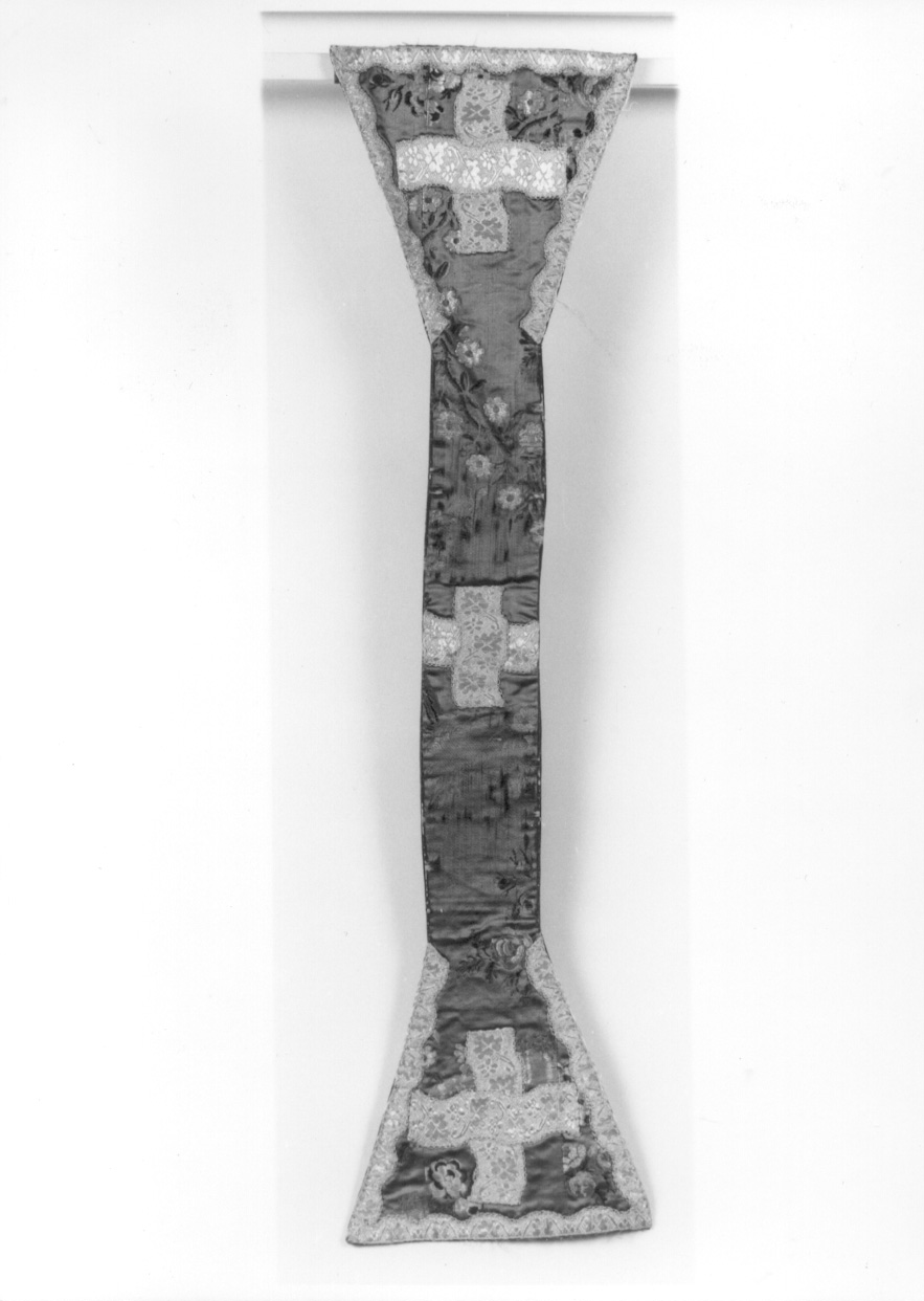 - NOTIZIE STORICO CRITICHE Il tessuto, nato assai probabilmente per l'abbigliamento femminile, è decorato con il motivo del meandro, decoro ideato a Lione verso gli anni Cinquanta del Settecento e che caratterizza la produzione tessile europea per tutto il terzo quarto del secolo. Alcuni elementi dell'ornato del raso impiegato per il paramentale permette di datare la stoffa alla metà del Settecento, torno di anni in cui si preferiscono fondi e disegni leggeri e aerei; inoltre il decoro appare influenzato dalla cultura orientale, come ci attesta l'idea del motivo dell'albero fiorito, in cui i fiori appiano fuori scala rispetto al tronco, che fluttua nello sfondo (C. BUSS, Seta oro e argento. Le sete operate del XVIII secolo, Milano 1992, pp. 75, 93). Questa datazione appare confermanta dal confronto con alcune testimonianze, quali, ad esempio, il frammento in cannelé simpleté broccato conservato presso il Kunstgewerbemuseum di Colonia, datato al sesto decennio del Settecento (B. MARKOWSKY, Europäische Seidengewebe des 13.-18. jahrhunderts, Colonia 1976, p. 332, scheda n. 585), il coevo frammento di gros de Tours lanciato e broccato, conservato nel medesimo museo (Idem, p. 332, n. 587) e il telo della collezione Cini (D. DAVANZO POLI, La Collezione Cini dei Musei Civici Veneziani. Tessuti antichi, in "Civici Musei veneziani d'arte e storia. Bollettino, 1989, vol. XXXIII, n. 1-4", p. 162, scheda n. 144). Un tessuto identico a quello impiegato per il parato vercellese è stato, infine, impiegato per confezione un parato conservato a Lectoure e datato da Aribaud verso il 1750 (C. ARIBAUD, Soieries en Sacristie. Fastes liturgiques. XVII° - XVIII° siècles, catalogo della mostra di Tolosa, Parigi 1998, pp. 116-117 e p. 151, scheda n. 51). Sulla base di quest'ultimo confronto, si può ipotizzare una provenienza francese del raso