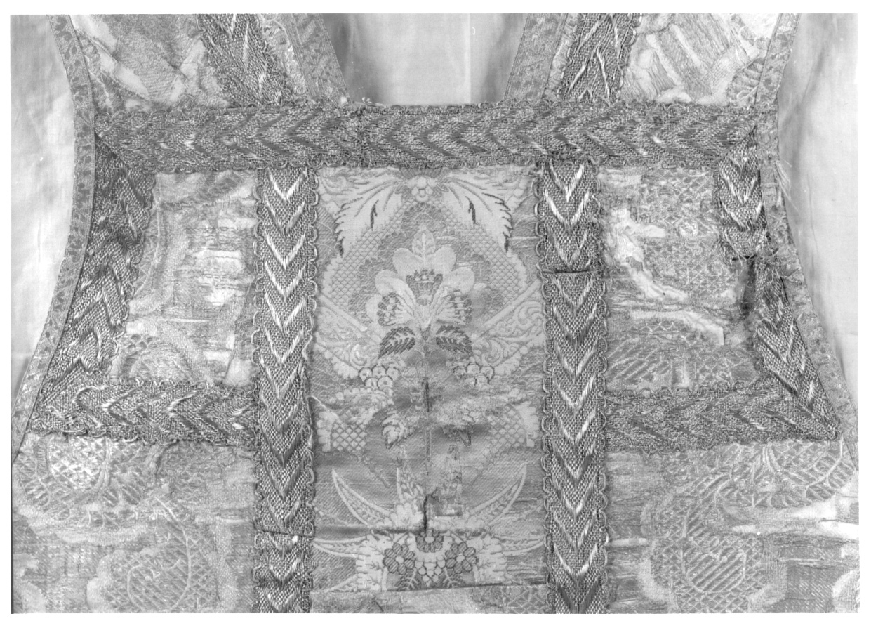 - NOTIZIE STORICO CRITICHE Il tessuto costituisce un esempio della tipologia, definita dlla critica, "a pizzo", diffusasi a cavallo fra il Seicento e Settecento, proprio per la ripresa, nei partiti decorativi delle stroffe, dei disegni e degli intrecci dei pizzi ( P. THORNTON, Baroque and Rococo Silks, Londra 1965, pp. 109-115, M. TASSINARI e M. CATALDI GALLO, Il patrimonio tessile, in G. ROTONDI TEREMINIELLO (a cura di), Il Museo del Santuario di N. S. di Misericordia, Savona 1999, p. 25; A. GRUBER, Das Spitzenmuster im 18. Jahrhundert - Les motifs à dentelle au XVIII siècle, catalogo della mostra, Riggesberg 1979, pp. 3-9). Sebbene le limitate dimensioni del frammento non permettano un'esaustiva analisi stilistica, appare accostabile a testimonianze datate intorno al primo quarto del settecento (si veda, ad esempio, B. MARKOWSKY, Europäische Seidengewebe des 13.-18. jahrhunderts, Colonia 1976, p. 302, scheda n. 504; P. THORNTON, 1965, pp. 111, 168, tav. 53A; D. DAVANZO POLI, Seta & Oro. La collezione tessile di Mariano Fortuny, catalogo della mostra, Venezia 1997, pp. 78-82, schede nn. 63-64; A. GRUBER, 1979, pp. 13, 15, 19, schede nn. 6, 8, 12; D. DEVOTI, D. DIGILIO e D. PRIMERANO (a cura di), Vesti liturgiche e frammenti tessili nella raccolta del Museo Diocesano Tridentino, Trento 1999, pp. 88-90, schede nn. 41-42 di D. Digilio; G. CANTELLI (a cura di), Magnificenza nell'arte tessile della Sicilia centro-meridionale. Ricami, sete e broccati delle Diocesi di Caltanissetta e Piazza Armerina, catalogo della mostra di Vicenza, Catania 2000, p. 411 e pp. 414-415, scheda n. 32 di V. Sola; M. VILLOTTA (a cura di), I paramenti sacri tra storia e tutela, Tavagnacco 1996, pp. 122-123, scheda n. 38 di M. Villotta; DAVANZO POLI, La Collezione Cini dei Musei Civici Veneziani. Tessuti antichi, in "Civici Musei veneziani d'arte e storia. Bollettino, 1989, vol. XXXIII, n. 1-4", pp. 103- 105, schede nn. 85-87; Indue me Domine. I tessuti liturgici del Museo Diocesano di Brescia, Venezia 1998, pp. 136-137, schede nn. 22-23 di A. Geromel Pauletti; A. R. MORSELLI e F. NEGRINI (a cura di), Le trame dell'invisibile: paramenti sacri a Castiglione delle Stiviere, catalogo della mostra, Castiglione delle Stiviere 1991, pp. 82-83, scheda n. 17; C. BUSS, Seta oro e argento. Le sete operate del XVIII secolo, Milano 1992, pp. 46-49). In assenza di documenti, si attribuisce dubitativamente il lampasso ad una manifattura italiana o francese
