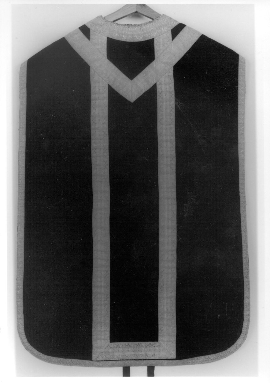 - NOTIZIE STORICO CRITICHE Nell'inventario della Cattedrale redatto nel 1792 è ricordato un "Paramentale in Veluto Nero guernito di Gallone d'argento a Bindello, e frangetta d'argento con Stole, e Manipoli: 1 Pianeta, 2 Dalmatiche, 2 Pluviali, 1 Velo da Calice, 1 Borsa da Calice, 1 Conroaltare, 1 Coperta del Legile" e inoltre sono menzionate " Cinque Pianete di veluto nero guernite di Gallone d'argento con stole, e manipoli molto usate: 5 Pianete, 5 Borse da Calice. Mancano i veli" (M. CAPELLINO (a cura di), Testimonianze scelte del rito "eusebiano", Vercelle 1999, p. 74). Nell'inventario esteso nel 1889, sotto la rubrica dedicata al pontificale in velluto nero, è descritto un "paramentale in parte usato e in parte nuovo. Nel primo vi è la pianeta completa, due tunicelle, stola e due manipoli; del secondo pianeta compita, due tunicelle con stola e manipolil: sì la vecchia come la nuova parte sono ornati di gallone grande in argento, più la frangia d'argento alle stole ed ai manipoli" (Archivio Capitolare di Vercelli, Fabbrica e Chiesa di S.t Eusebio cerimoniali = dritti di banchi = altri dritti di chiesa = Riti, e Funzioni - Accetazione del Breviario Romano, Inventario degli oggetti mobili della Chiesa Metropolitana di Vercelli fatto nell'anno 1889, ff. 9-10). Assai probabilmente l'insieme liturgico potrebbe essere riconosciuto nel "paramentale in parte usanto" citato nel 1889. I galloni che impreziosiscono l'insieme liturgico appaiono confrontobali con manufatti collocati nel XIX secolo, quali ad esempio i due frammenti di gallone della collezione Gandini (T. SCHOENHOLZER NICHOLS e I. SILVESTRI, 2002, p. 272, schede nn. 441 e 443, di L. Lorenzini). Si ipotizza una data al primo quarto dell'Ottocento, dal momento che il parato non appare riconoscibile in quello menzionato nel 1792