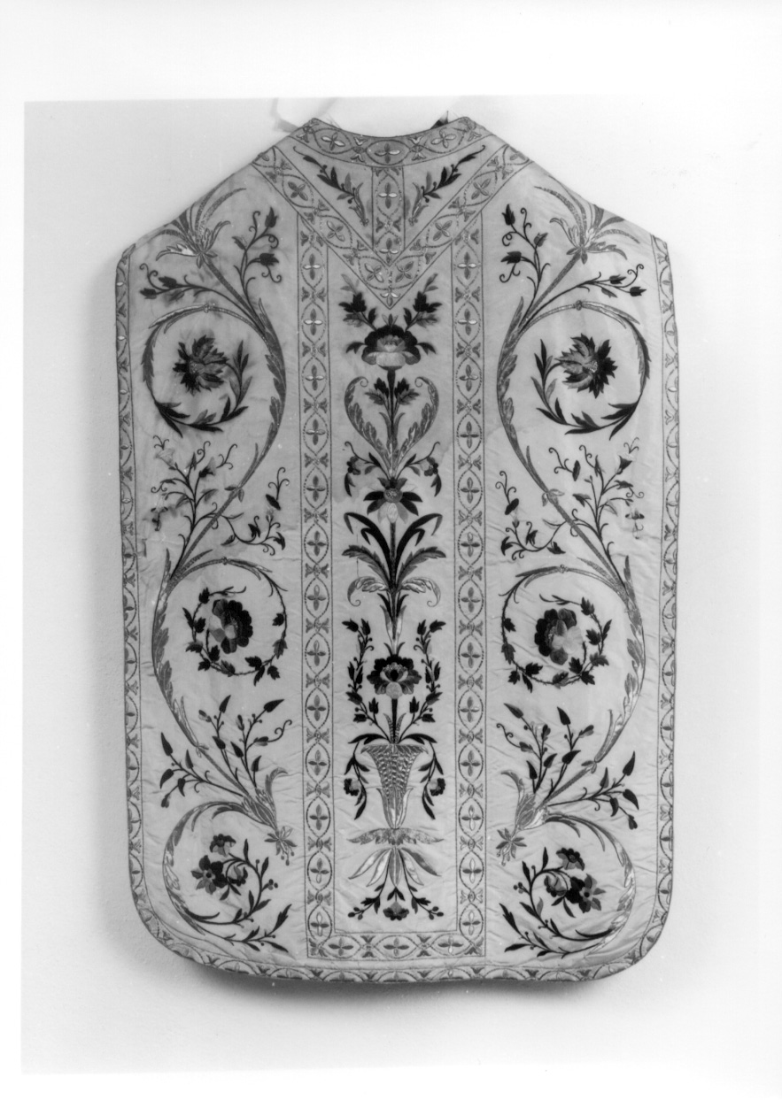 - NOTIZIE STORICO CRITICHE Nella seconda metà dell'Ottocento, soprattutto in ambito ecclesiastico, si assiste alla ripresa dei motivi decorativi settecenteschi, interpretati però con il gusto eclettico tipico di quegli anni e spesso sovraccaricando di elementi decorativi le composizione dal disegno rigido e privo di quella vivacità che spesso caratterizza gli ornati del secolo precedente, come testimoniano la pianeta, ancorata alla metà del Settecento, della parrocchiale dei santi Nazaro e Celso a Castiiglione delle Stiviere (A. R. MORSELLI e F. NIGRINI (a cura di), Le trame dell'invisibile: paramenti sacri a Castiglione delle Stiviere, catalogo della mostra, Castiglione delle Stiviere 1991, pp. 112-113, scheda n. 32) e la pianeta, datata al 1770-1790, di Pietraperzia (G. CANTELLI (a cura di), Magnificenze nell'arte tessile della Sicilia centro-meridionale. Ricami, sete e broccati delle Diocesi di Caltanissetta e Piazza Armerina, catalogo della mostra di Vicenza, Catania 2000, vol. II, pp. 776-777, scheda n. 186 di M. Carmignani). I motivi desunti dall'ornato settecentesco, quali vasi e ghirlande, sono inoltre unite ad elementi più tardi, quali i girali d'acanto che si ritrovano spesso nei parati del primo quarto dell'Ottocento ( si veda, ad esempio, San Lorenzo i documenti e i tesori nascosti, catalogo della mostra di Firenze, BVenezia 1993, p. 213 scheda n. 4.12 di P. Peri; L. FORNARI SCHIANCHI, "Per uso del santificare et adornare". Gli arredi di Santa Maria della Steccata Argenti/Tessuti, Parma 1991, pp. 208-209, schede nn. 124-125 di M.Cuoghi Costantini). Il parato può infatti essere confrontato con il parato datato al 1843 dagli emigrati di Chiavenna (G. SCARAMELLINI, I tesori degli emigrati. I doni degli emigrati della provincia di Sondrio alle chiese di origine nei secoli XVI-XIX, ctalogo della mostra di Sondrio, Cinisello Balsamo 2002, pp. 248-249, schede nn. 21-23 di G. Scaramellini), alcuni servizi liturgici, datati nei decenni centrali dell'Ottocento, della basilica di san Cassiano di Comacchio ( N. CLERICI BAGOZZI e A. ZAMBONI (a cura di), I tesori nascosti delle chiese di Comacchio, catalogo della mostra di Comacchio, Ferrara 2000, pp. 270-274, schede nn. 1719 di S. Frasca e D. Mascalchi), la pianeta, del terzo quarto dell'Ottocento, del Museo Diocesano di Brescia (Indue me Domine. I tessuti liturgici del Museo Diocesano di Brescia, Venezia 1998, pp. 167-168, scheda n. 75 di A. Geromel Pauletti), la pianeta della ditta Bertarelli del 1860 della cattedrale di San Pietro di Ales (Paramenti sacri. Tessuti serici del Duomo di Ales dal '600 al '900, catalogo della mostra di Ales, Cagliari 1998, p. 43, scheda n. 35 di A. Pasolini) la pianeta degli inizi del secolo successivo del Museo Diocesano Tridentino (D. DEVOTI, D. DIGILIO e D. PRIMERANO (a cura di), Vesti liturgiche e frammenti tessili nella raccolta del Museo Diocesano Tridentino, Trento 1999, p. 203, scheda n. 165 di D. Digilio) e con la pianeta, donata nel 1895 da Monsignor Zucchinio a San Pietro di Bologna (F. VARIGNANA (a cura di), Il tesoro di san Pierto in Bologna e Papa Lambertini, catalogo della mostra. Bologna 1997, p. 260, scheda n. 163
