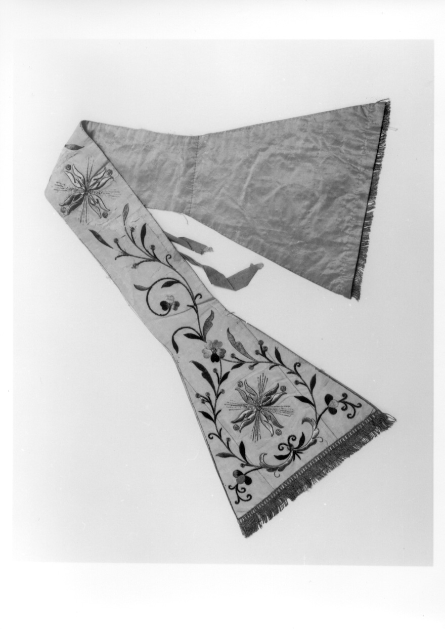 Il manipolo è realizzato in taffetas ricamato a girali da cui nascono ramoscelli fioriti e fiori isolati