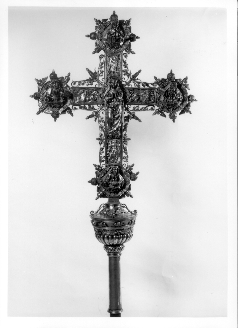 Tubo d'innesto sormontato da nodo a vaso; montante e traversa con terminazioni circolari e decorazioni a placchetta. Decorazione: baccellature e ghirlande floreali e testine angeliche sul nodo. Sul recto affiancano l'Assunta i quattro Evangelisti con i loro simboli. Sul verso al centro Cristo Crocifisso e ai lati: S. Giovanni e la Madonna, in basso Maria Maddalena e il pellicano in alto. Decorazione: volute e motivi fitomorfi a giorno nei bracci della croce; pinnacoli tra volute fitomorfe all'incrocio dei bracci; pigne e a ghiande con alette nelle terminazioni