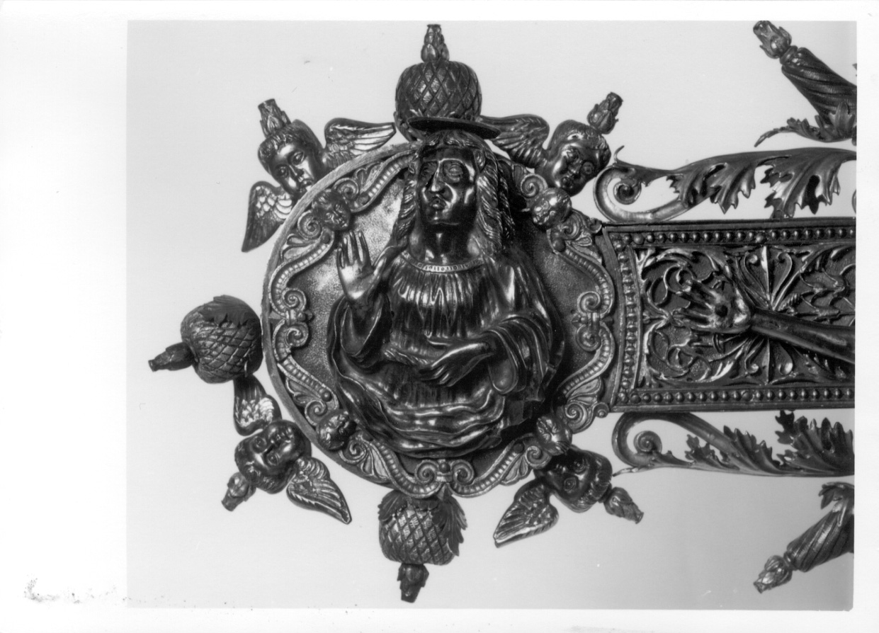 Mezza figura in rilievo, di tre quarti con volto incorniciato da lunghi capelli. La mano destra è alzata