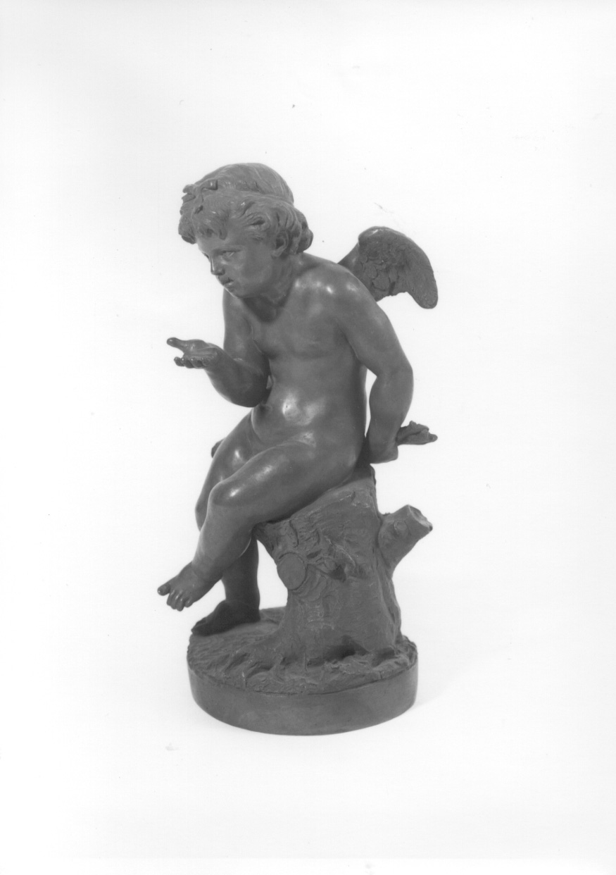 La scultura poggia su piccolo basamento a sezione circolare. Un putto alato è rappresentato di tre quarti, seduto su un tronco d'albero. Un nastro è legato intorno ai capelli con un fiocco centrale. Nella mano nascosta dietro la schiena tiene due frecce