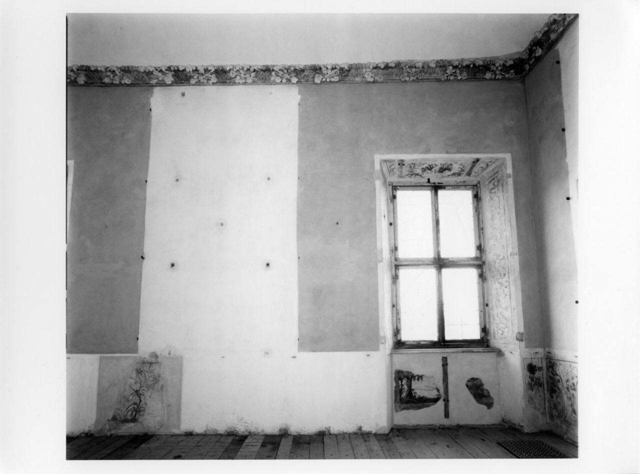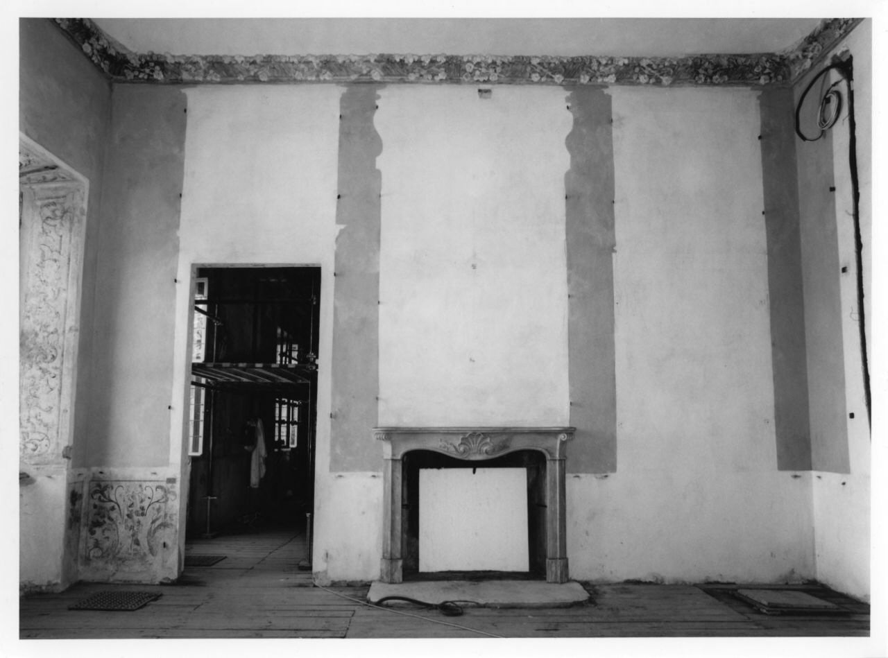 La decorazione plastica delle pareti, all'imposta della volta, si presenta come un cornicione ad elementi vegetali dorati ornato da rami fioriti di colore bianco