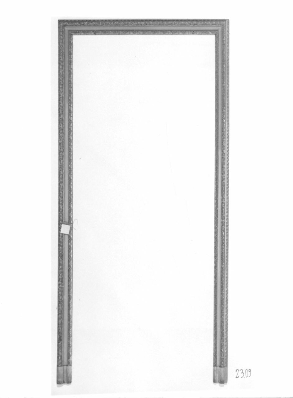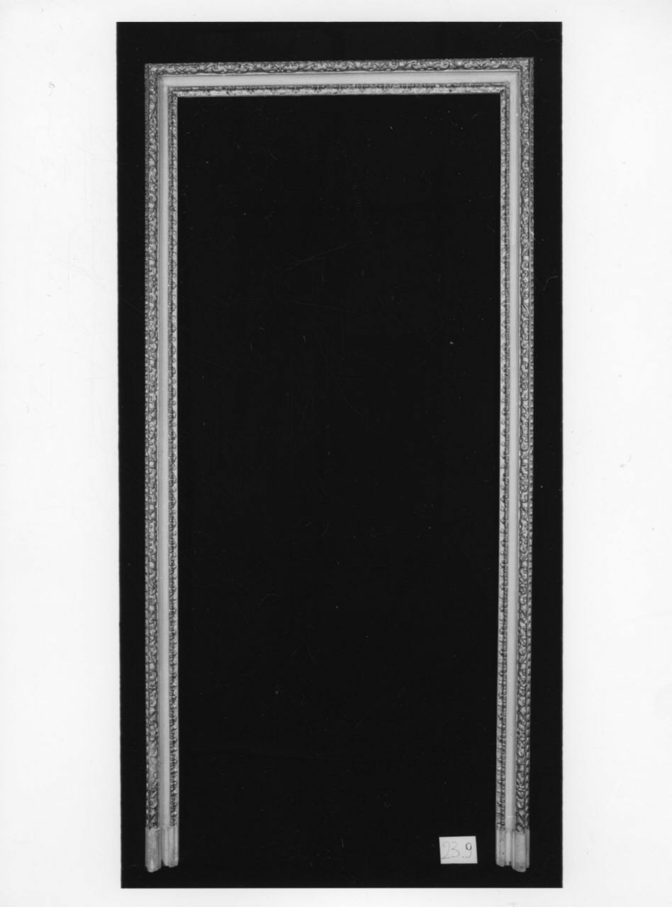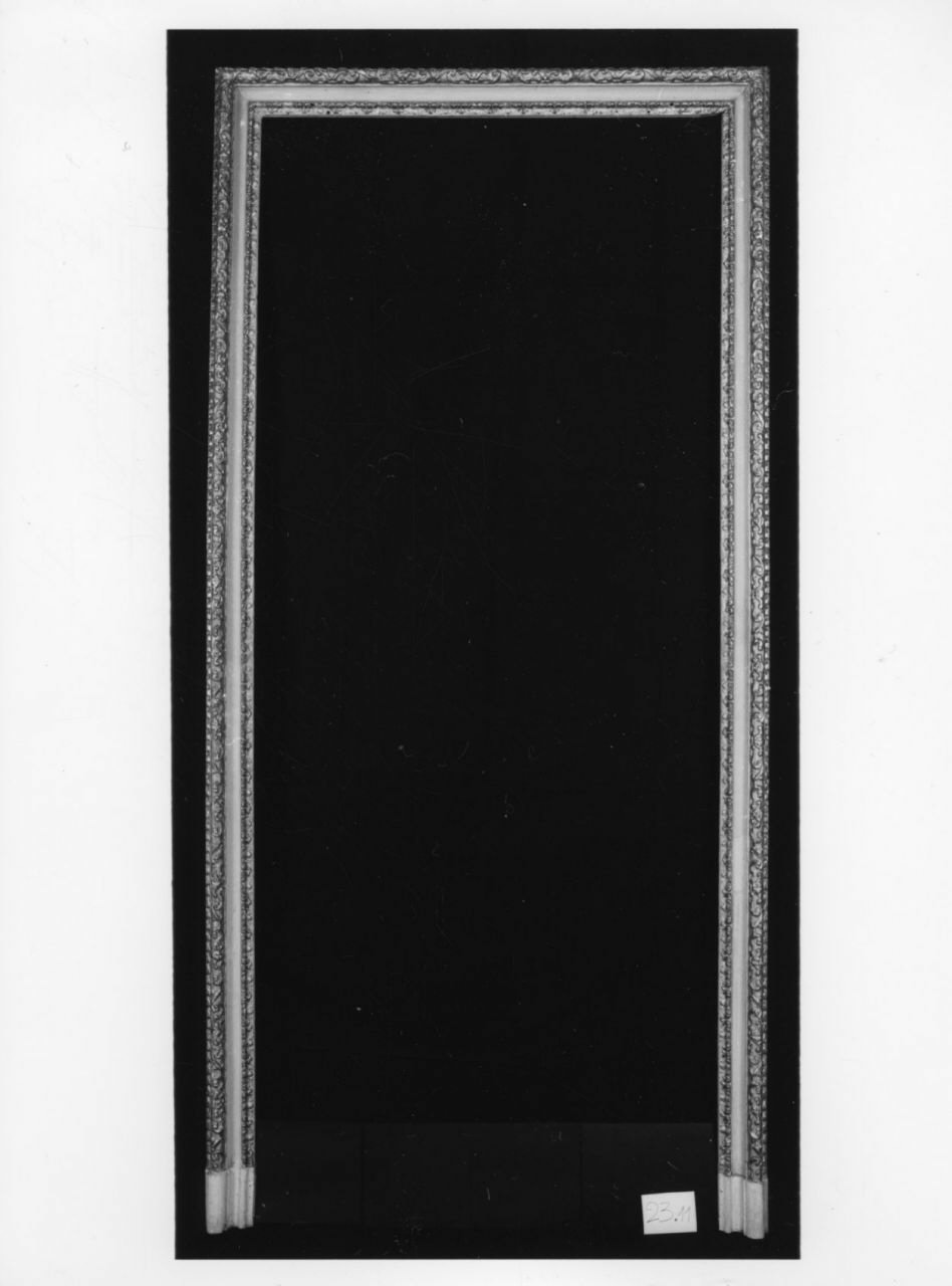 - NOTIZIE STORICO CRITICHE Dall'"Inventaro de mobili, ed altri oggetti esistenti nel Palazzo della Vigna di S. M." (Torino, Biblioteca Reale - sc. 45) compilato nel 1755, risulta che l'"Anticamera verso Ponente" dell'Appartamento di S. M. era dotata di "Quattro chiambrane, parte intagliate, e dorate, e parte gessate". La successiva inventariazione compilata nel 1767 ripete alla lettera questa descrizione. Ulteriori accenni alle quattro chiambrane si ritrovano solo negli inventari ottocenteschi: nel 1845 Felice Boozoky nell'"Inventario di tutti li mobili, oggetti di addobbamento ed altri diversi di Regia Spettanza esistenti nel Palazzo della Vigna Reale detta della Regina e nelli fabbricati dipendenti [...]" (ASTO, Corte, Archivi Privati, Castelli Berroni - m. 19) posti sotto la sua custodia ricorda nella stanza ormai indicata semplicemente come "Anticamera" "Quattro Stipiti alle porte di legno colorito bigio con tre membrature intagliate a foglie e rosoni e dorate [...]". Ancora più schematica è la descrizione riportata nei "Testimoniali di Stato della Vigna della Regina ed annesso Palazzo Chiablese" (ASTO, Corte, Istituti Assistenza e Beneficenza - cat. 11, m. 653) compilati nel 1864: "N° 4 stipiti con sopraporta decorati oltre membrature intagliate e dorate con fondo bigio" e nell'"Inventario dell'Istituto Nazionale per le Figlie dei Militari Casa della Villa della Regina Castello" compilato nel 1890 che registra nella "sala gialla attigua al salone" quattro chiambrane "e sopra porte di legno dorate con arabeschi e dipinti ad olio". Le quattro mostre di porte sono oggi inventariate rispettivamente con i numeri 23.10 (parete sud), 23.09 (parete est), 23.07 (parete est) e 23.06 (parete nord). La cornice 23.10 è ancora fissata al suo telaio (altezza 286, larghezza 162, profondità 2).Le indagine condotte dal dott. Stefano Volpin hanno evidenziato la presenza di uno strato preparatorio composto da almeno quattro stesure sovrapposte di gesso e colla animale, ingessatura che nel complesso risulta piuttosto porosa e non particolarmente compatta. Su questa si stende un sottile film di colore rosso-arancio identificato, per aspetto e composizione, con un bolo rosso, formato cioè da argille ricche di ossidi di ferro. Si tratta del tradizionale fondo cromatico adesivo per la sovrastante metallizzazione applicata a guazzo, della quale rimangono tracce sottilissime ed irregolari. Si tratta di una foglia d'oro puro. Sopra l'oro è presente un sottile ed irregolare film pittorico grigio composto da una sorta di tempera grassa, molta biacca e isolate e piccolissime tracce forse ascrivibili a del nerofumo. In alcuni punti sono state inoltre ritrovate isolate particelle azzurre dall'aspetto vetroso, identificate come blu di smalto o smaltino. Questo pigmento è già stato identificato in altri elementi pittorici della Villa, ma solo nelle pitture murali in quanto tipico pigmento per l'affresco