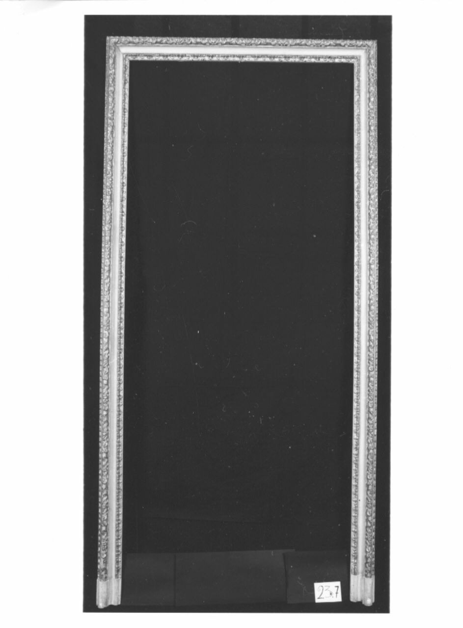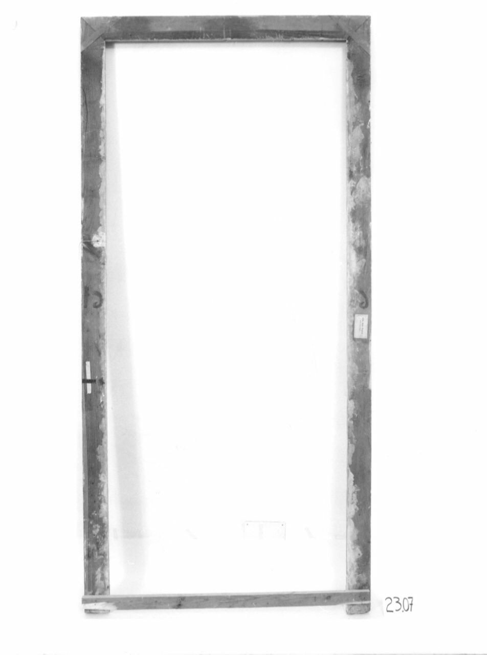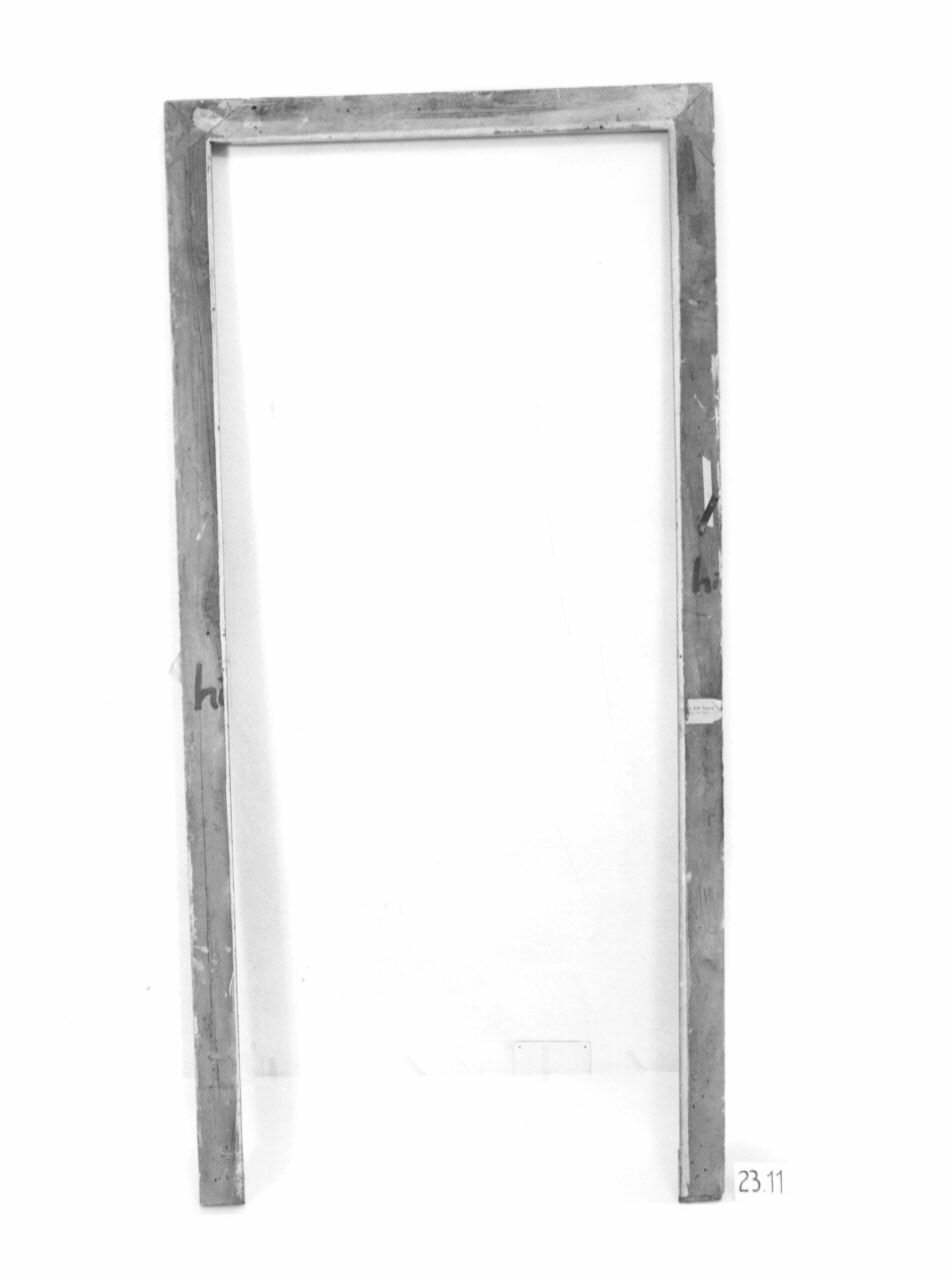 - NOTIZIE STORICO CRITICHE Dall'"Inventaro de mobili, ed altri oggetti esistenti nel Palazzo della Vigna di S. M." (Torino, Biblioteca Reale - sc. 45) compilato nel 1755, risulta che l'"Anticamera verso Ponente" dell'Appartamento di S. M. era dotata di "Quattro chiambrane, parte intagliate, e dorate, e parte gessate". La successiva inventariazione compilata nel 1767 ripete alla lettera questa descrizione. Ulteriori accenni alle quattro chiambrane si ritrovano solo negli inventari ottocenteschi: nel 1845 Felice Boozoky nell'"Inventario di tutti li mobili, oggetti di addobbamento ed altri diversi di Regia Spettanza esistenti nel Palazzo della Vigna Reale detta della Regina e nelli fabbricati dipendenti [...]" (ASTO, Corte, Archivi Privati, Castelli Berroni - m. 19) posti sotto la sua custodia ricorda nella stanza ormai indicata semplicemente come "Anticamera" "Quattro Stipiti alle porte di legno colorito bigio con tre membrature intagliate a foglie e rosoni e dorate [...]". Ancora più schematica è la descrizione riportata nei "Testimoniali di Stato della Vigna della Regina ed annesso Palazzo Chiablese" (ASTO, Corte, Istituti Assistenza e Beneficenza - cat. 11, m. 653) compilati nel 1864: "N° 4 stipiti con sopraporta decorati oltre membrature intagliate e dorate con fondo bigio" e nell'"Inventario dell'Istituto Nazionale per le Figlie dei Militari Casa della Villa della Regina Castello" compilato nel 1890 che registra nella "sala gialla attigua al salone" quattro chiambrane "e sopra porte di legno dorate con arabeschi e dipinti ad olio". Le quattro mostre di porte sono oggi inventariate rispettivamente con i numeri 23.10 (parete sud), 23.09 (parete est), 23.07 (parete est) e 23.06 (parete nord). La cornice 23.10 è ancora fissata al suo telaio (altezza 286, larghezza 162, profondità 2).Le indagine condotte dal dott. Stefano Volpin hanno evidenziato la presenza di uno strato preparatorio composto da almeno quattro stesure sovrapposte di gesso e colla animale, ingessatura che nel complesso risulta piuttosto porosa e non particolarmente compatta. Su questa si stende un sottile film di colore rosso-arancio identificato, per aspetto e composizione, con un bolo rosso, formato cioè da argille ricche di ossidi di ferro. Si tratta del tradizionale fondo cromatico adesivo per la sovrastante metallizzazione applicata a guazzo, della quale rimangono tracce sottilissime ed irregolari. Si tratta di una foglia d'oro puro. Sopra l'oro è presente un sottile ed irregolare film pittorico grigio composto da una sorta di tempera grassa, molta biacca e isolate e piccolissime tracce forse ascrivibili a del nerofumo. In alcuni punti sono state inoltre ritrovate isolate particelle azzurre dall'aspetto vetroso, identificate come blu di smalto o smaltino. Questo pigmento è già stato identificato in altri elementi pittorici della Villa, ma solo nelle pitture murali in quanto tipico pigmento per l'affresco