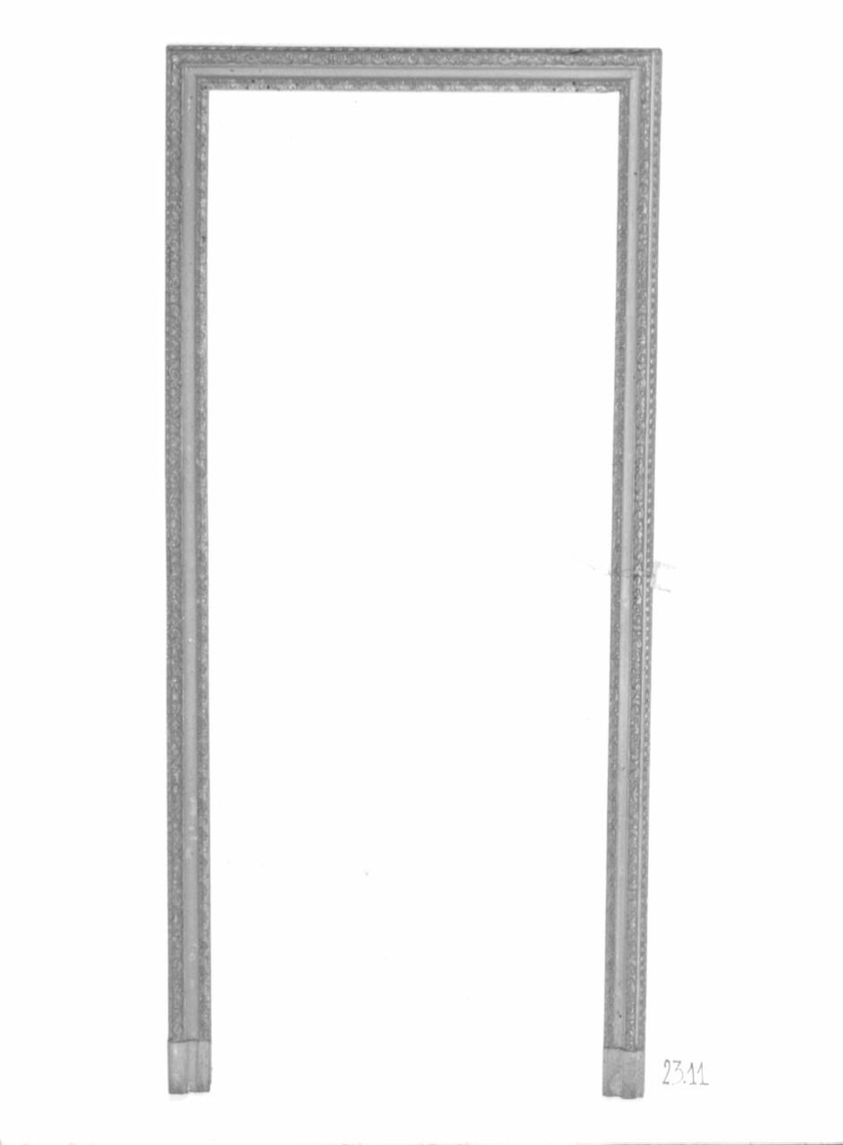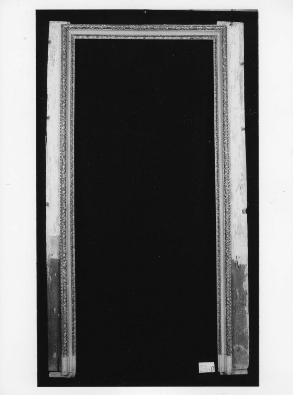 Serie di quattro mostre di porta a luce rettangolare con una prima battuta intagliata a motivi vegetali dorati, seguita da una gola liscia dipinta in grigio chiaro e un ulteriore motivo a girali e piccole foglie dorate