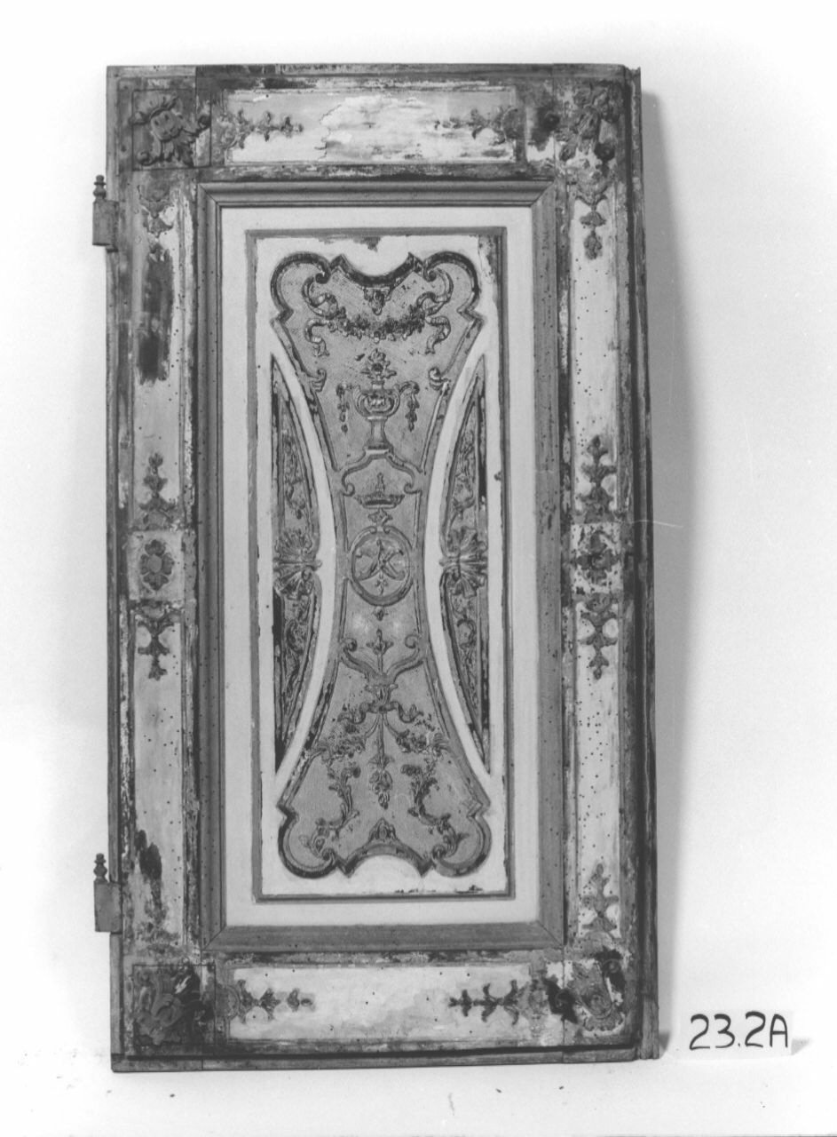 - NOTIZIE STORICO CRITICHE Gli scuri che chiudono le due finestre della parete ovest sono ricordati per la prima volta nell'"Inventario di tutti li mobili, oggetti di addobbamento ed altri diversi di Regia Spettanza esistenti nel Palazzo della Vigna Reale detta della Regina e nelli fabbricati dipendenti, posti sotto la custodia del Concierge sig. Felice Boozoky (ASTO, Corte, Archivi Privati, Castelli Berroni - m. 19) nel 1845, che registra nell'"Anticamera" degli Appartamenti Reali a mezzanotte "due Chiassili alle finestre con imposte intagliate in parte colorite ed in parte dorate muniti della debita ferramenta, una provvista di spranga di ferro per assicurazione delle imposte". Una descrizione molto schematica è offerta anche dai "Testimoniali di Stato della Vigna della Regina ed annesso Palazzo Chiablese" (ASTO, Corte, Istituti Assistenza e Beneficenza - cat. 11, m. 653) compilati nel 1864 che segnalano "Due finestre con chiassile, antescuri, gelosia, davanzale esterno ed interno uguali in tutto ai descritti al N. 5 [Antescuri a panelli con cornice all'ingiro in legno forte ed avente filetti dorati e fondo dipinti ad arabeschi]"; infine nel 1931 Merlo nel suo "Elenco dei Mobili e degli Oggetti Vari per Ambienti" (ASTO) ricorda nella stanza ormai indicata come "Sala S. M. Vittorio Emanuele II° e S. M. Adelaide" "le imposte [...] dipinte con fregi e dorate". Le quattro ante che compongono gli scuri della seconda finestra della parete ovest sono oggi inventariate con i numeri 23.02, 23.02 A, 23.02 B e 23.02 C. Sono in legno di noce con fondo dipinto in azzurro-grigio chiaro, come il resto degli arredi fissi di quest'ambiente, e intagli dorati. Il battente 23.02 C è completamente bruciato nella parte centrale a causa dell'esposizione diretta al calore del sole e non presenta il fondo zigrinato che invece caratterizza le altre ante. Potrebbe quindi trattarsi di un rifacimento. Poco dopo il 1924 Arturo Midana pubblicava una di queste ante soffermandosi su un aspetto particolare della loro decorazione: i pannelli recano infatti al centro un monogramma da lui identificato con quello di Vittorio Amedeo II (1666-1732) "sormontato dalla corona ducale soltanto, onde dovrebbe essere stato eseguito prima del 1713 [...]" (A. Midana, L'arte del legno in Piemonte nel Sei e Settecento, Torino s. d., fig. 75). Nel 1963 anche Marziano Bernardi pubblicava uno degli scuri di questa stanza sottolineando come "gli scuretti delle finestre hanno ancora la loro decorazione pittorica originale" (1963, p. 101)