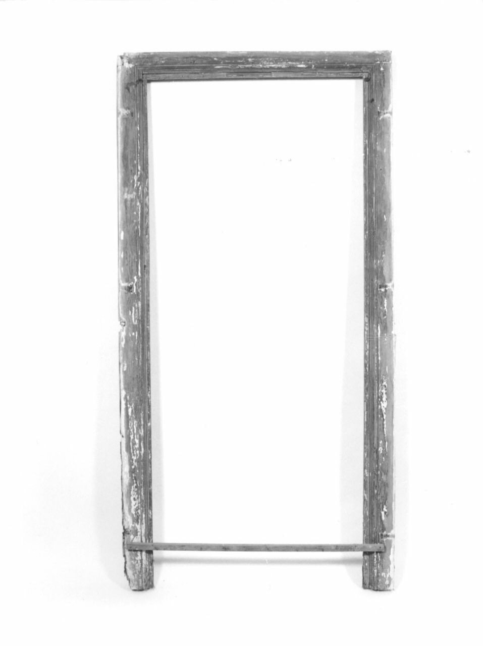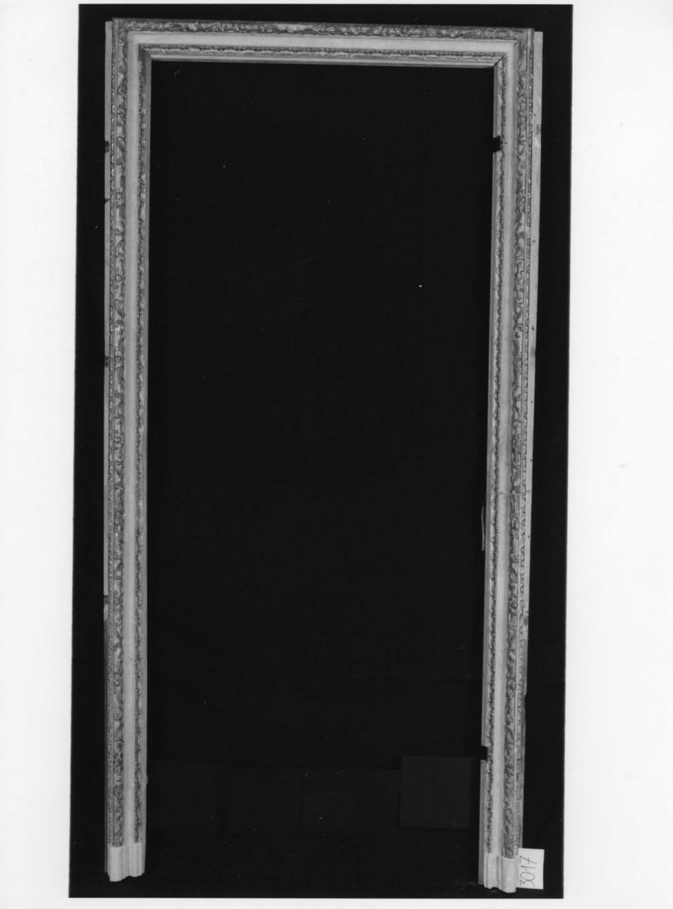 Serie di quattro cornici di porta a luce rettangolare con battuta intagliata a motivi vegetali e girali dorati, gola liscia dipinta in grigio, e una seconda membratura con ornati a foglie dorate