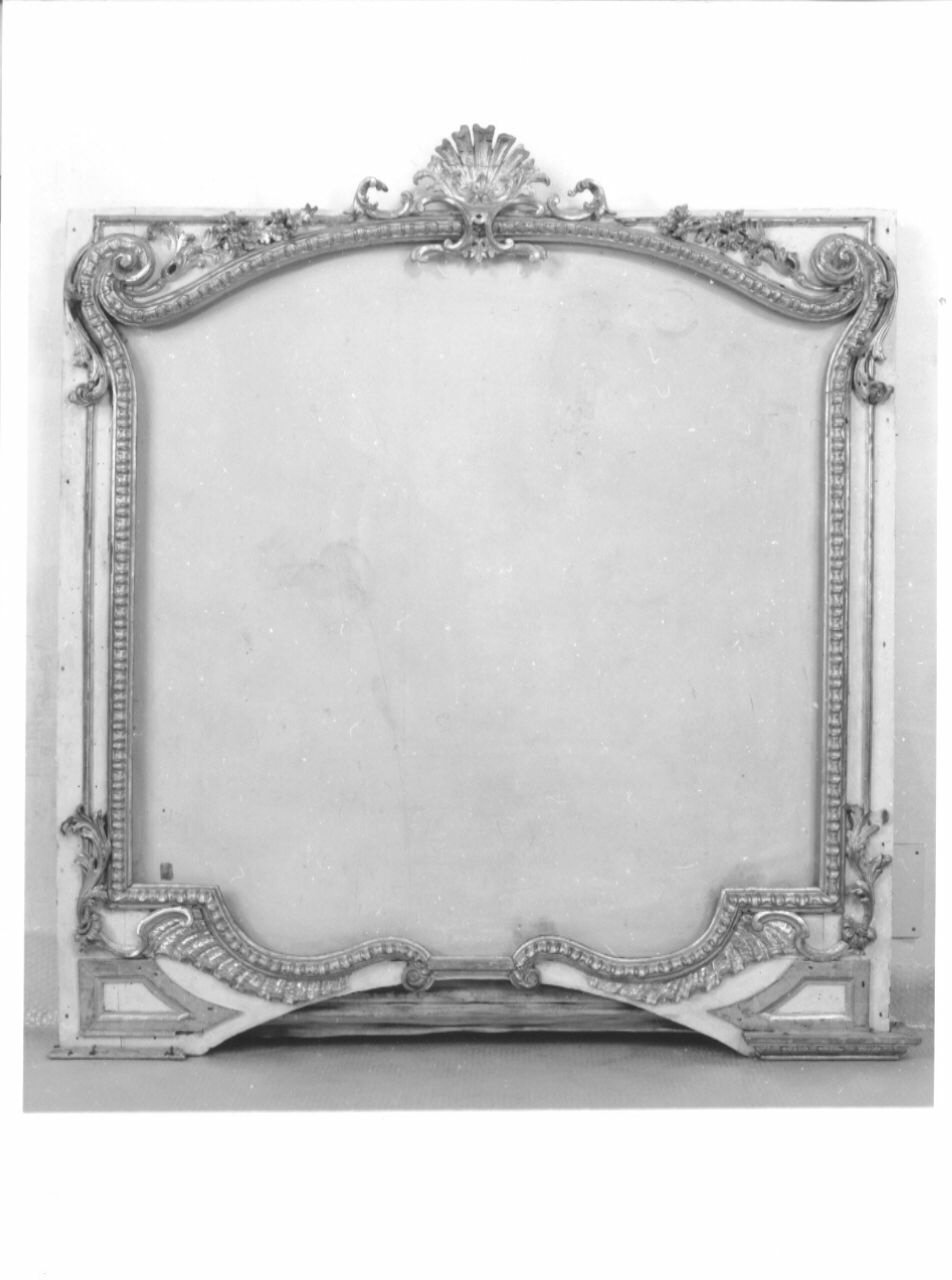 - NOTIZIE STORICO CRITICHE La "Camera del letto verso Ponente" dell'Appartamento di S. M. è ornata da sei cornici di sovrapporta indicate nell'inventario corrente con i numeri 24.01, 24.12, 24. 11, 24.10, 24.09 e 24.07. La loro presenza in questa sala è attestata fin dal 1755, quando sono descritte nell'"Inventaro de mobili, ed altri oggetti esistenti nel Palazzo della Vigna di S. M." (Torino, Biblioteca Reale - sc. 45): "Sei altri (quadri) a Sovraporta [...] con cornici ad intagly dorati, e bianchi". Il successivo inventario compilato nel 1767 ripete alla lettera questa descrizione. Nel secolo seguente le cornici sono sinteticamente registrate solo nei "Testimoniali di Stato della Vigna della Regina ed annesso Palazzo Chiablese" compilati nel 1864 (ASTO, Corte, Istituti Assistenza e Beneficenza - cat. 11, m. 653): "[...] sopraporta [...] contornati da cornice ed ornati intagliati e dorati". Nel 1942 le "bellissime cornici dorate" sono ancora ricordate da Eugenio Olivero che le dice ormai dotate di "sopraporte moderni rappresentanti paesaggi non [...] adatti alla bellezza degli affreschi" che decorano la volta di questa stanza (E. Olivero, La Villa della Regina in Torino, Torino 1942, p. 26). Le sei cornici, restaurate presso il laboratorio di Barbara Gioia Rinetti, ospitavano in origine altrettante tele realizzate da Corrado Giaquinto probabilmente nella seconda metà degli anni Trenta del Settecento, raffiguranti episodi dell'Eneide, ora a Roma, al Palazzo del Quirinale (cfr. L. Laureati, Corrado Giaquinto, in G. Briganti, L. Laureati, L. Trezzani, a cura di, Il patrimonio artistico del Quirinale. Pittura Antica La Quadreria, Roma 1993, pp. 88-99), ma documentate a Villa della Regina fino al 1880, quando vengono trasferite al Castello di Moncalieri e poi a Roma dal 1893