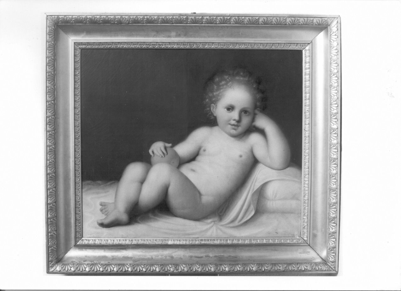 Dipinto raffigurante un putto nudo su un letto con frutto in mano, entro cornice in legno intagliato e dorato con motivo a foglie lanceolate all'interno e palmette all'esterno