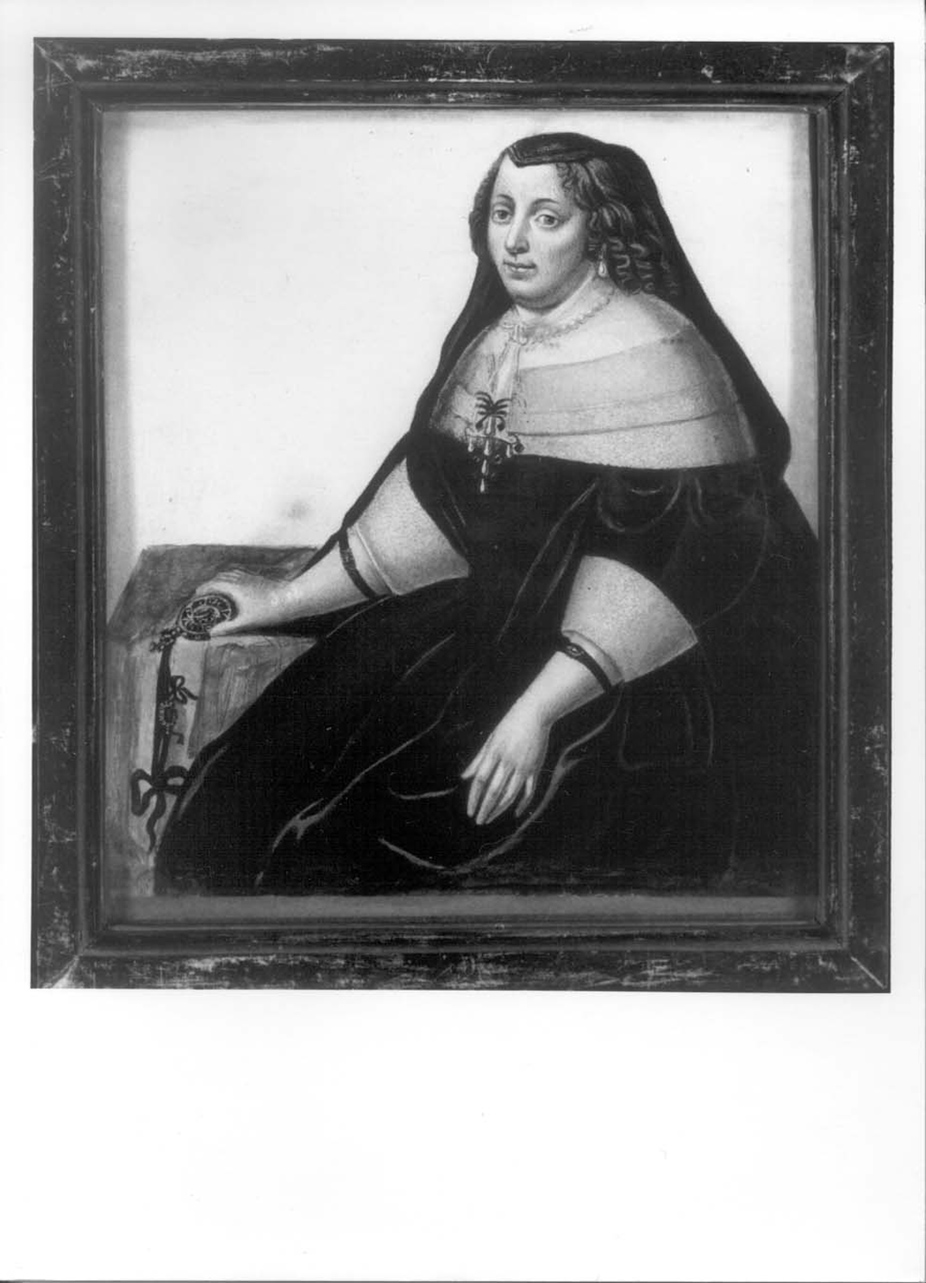 La donna è raffigurata seduta; indossa un voluminoso abito nero con alti bordi bianchi alle maniche e sullo scollo ed un velo scuro. Porta gioielli di perle e tiene nella mano sinistra un medaglione legato con un nastro nero. Cornice liscia in legno scuro