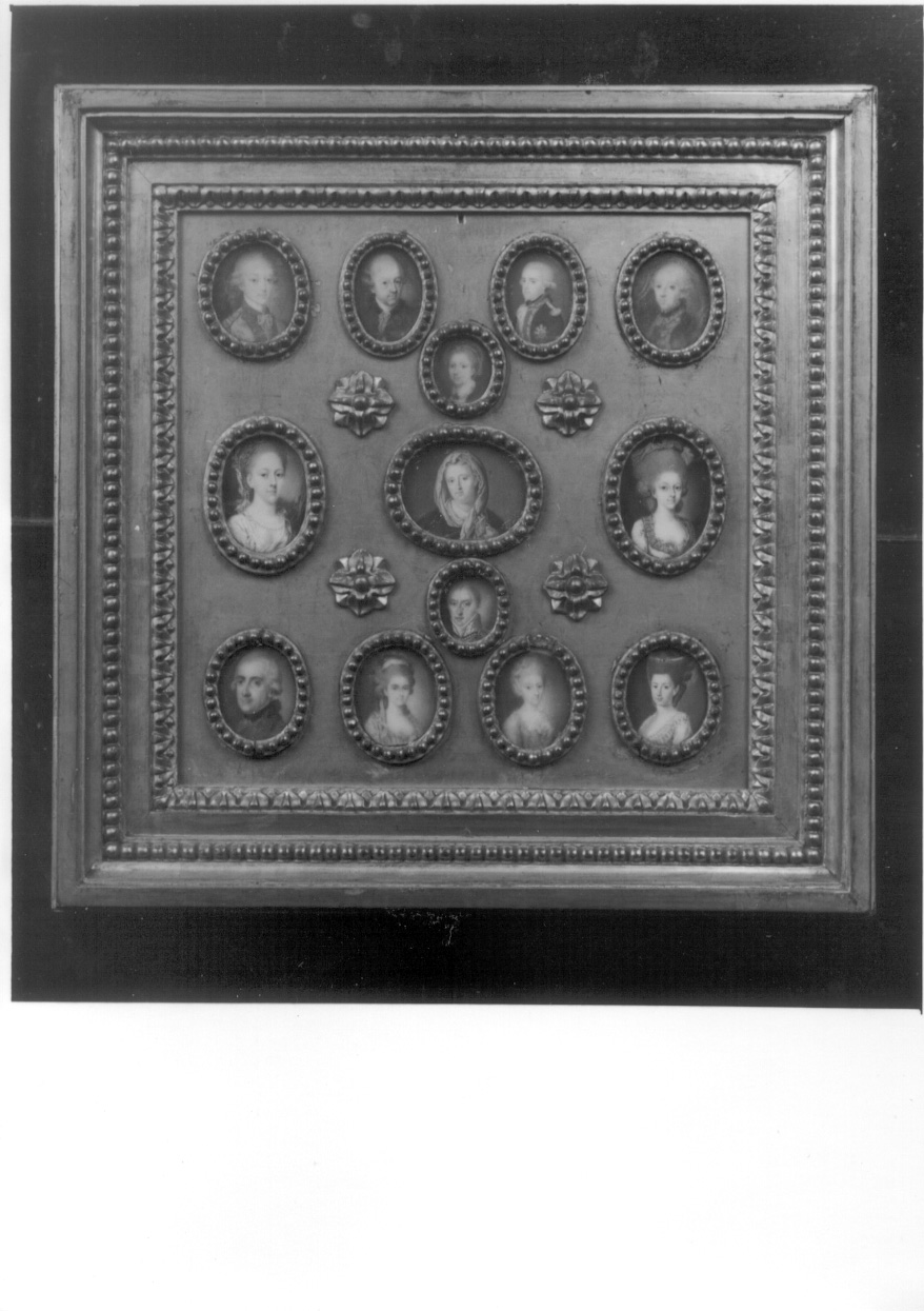 - NOTIZIE STORICO CRITICHE Dati generali sulle miniature1737 l'abate G. F. Ramelli dona a Carlo Emanuele III le prime 68 miniature del nucleo (A. BAUDI DI VESME, Schede. L'arte in Piemonte, vol. III, 1968, p. 888)1758-1766 Carlo Emanuele III commissiona a Giuseppe Lavy 71 ritratti in miniatura, a partire dalle origini della dinastia (A. BAUDI DI VESME, Schede. L'arte in Piemonte, vol. II, Torino 1966, p. 617-619) - per inciso si segnala che in tali anni è contemporaneamente attivo per la corte il miniaturista Giovanni Domenico Gambone -; dalla consultazione della Banca dati documentaria inerente il Palazzo Reale di Torino, come si desume dalla scheda n. 140881 di P. Traversi, in data 24 maggio 1749 sono segnalate 8 miniature già fatte pervenire da Roma al re da G. Lavy (AST, Camerale Piemonte, art. 217, 1749, cap. 6, art. 120)1799 Memoria Brambilla inerente i dipinti asportati dai francesi: sono segnalate 24 miniature ovali del Ramelli, senza specifiche ulteriori di soggetto e 10 quadri del Gabinetto del Ramelli (poté trattarsi dei dipinti del Nogari?); le 24 miniature razziate sarebbero dunque parte del nucleo di 48 ovali attribuiti al Ramelli, con cornici scolpite e dorate, stimati nell'insieme 1600 franchi, di cui al n° 585 dell'Inventaire descriptif, et estimatif des meubles existants dans les Palais Imperiaux de Turin, et Stupinis et leurs dependances, Cabinet à L'Ouest dit de Ramelli (consultato in copia presso la Galleria Sabauda, s.d., ma 1805 (?), Maison del Empereur, f. 42) 1815 l'Inventaro de' mobili esistenti ne' Reali appartamenti del Palazzo di Torino, redatto dal concierge Giuseppe Deville e datato 6 maggio 1815 (consultato in copia presso la Galleria Sabauda, ff. non numerati), nel Cabinetto detto delle miniature segnala "Un boesaggio che copre tutto il cabinetto comperto de' quattro ghiaccie e quantità di pezzi di ghiaccie contornate di cornici intagliate e dorate, di quaranta miniature del padre Ramelli (.)"1815-1830 tra i miniaturisti attivi in Palazzo Reale si segnalano Luigi Poggiuoli e Carlo Vacca (quest'ultimo autore, secondo C. Rovere, dei 2 ritratti miniati di Maria Clotilde e Maria Teresa inglobati nella specchiera della Sala del Consiglio)1880 i due quadretti con l'insieme di miniature sono schedati come unicumDati generali sui Gabinetti delle miniature1737 immediatamente a ridosso di tale data le prime 68 miniature del Ramelli sono collocate in un Gabinetto detto del Ramelli, poi Cappella privata della Regina1738-1740 sempre secondo il Rovere (C. ROVERE, Descrizione del Reale Palazzo di Torino, Torino 1858, p. 94) si realizzano due Gabinetti delle miniature: in uno verrebbero collocate 40 miniature del Ramelli (il progetto di allestimento si deve alla collaborazione di Alfieri e Bos: non emergono dati al riguardo in A. BELLINI, Benedetto Alfieri, Milano 1978, pp. 293-303, dove si indagano gli interventi interni al Palazzo Reale esegui dall'Alfieri tra il 1739 e il 1767), nell'altro quelle di Lavy (l'affermazione è da confutare, poiché le miniature di Lavy non giungono prima del 1758; forse nel secondo Gabinetto vennero collocate le 28 miniature del Ramelli mancanti per arrivare al nucleo originario di 68?)1831 Carlo Alberto Re di Sardegna, sotto la direzione di Palagi, è il committente dello smantellamento delle miniature del Ramelli, collocate nella sede attuale, unitamente a quelle del Lavy1844-1845 si registrano i pagamenti a Gabriele Capello "Nell'occasione che dovettero dorare tutte le cornici dei piccoli ritratti in miniatura che sono nella camera attigua alla Capella di S. M. la Regina [.] fatto ricerca nel R.o Guardamobile di due piccoli ritratti mancanti [.]" (Banca dati documentaria inerente il Palazzo Reale di Torino, scheda n. 121600, S. Ghisotti, AST, Camerale Piemonte, Parcelle e conti, 1844, reg. n. 5459, n. 1035/1-2; vedi inoltre scheda n. 51313, M. Benente, AST, Camerale Piemonte, Parcelle e conti, 1844, reg. n. 5459, mandato n. 2050, n. 1086, pagamento a Angelo Agnati del 17 giugno 1845 per indoratura di ornati, chiambrane, cornici e quadri del Gabinetto delle Miniature)1847 in tale data si colloca l'unico documento riconducibile con buona approssimazione all'insieme di miniature oggetto della presente scheda: Gabriele Capello è pagato "Per il Gabinetto delle Miniature riparato uno dei quadretti contenenti varie miniature unite, tenute da un giro di perle [.]" (Banca dati documentaria inerente il Palazzo Reale di Torino, scheda n. 121500, S. Ghisotti, AST, Camerale Piemonte, Parcelle e conti, 1847, reg. n. 5471, n. 418, 10 marzo 1847)1858 poco prima di tale data - quella di edizione della Descrizione del Reale Palazzo del Rovere - è costruita la parte di Gabinetto che guarda a levante%