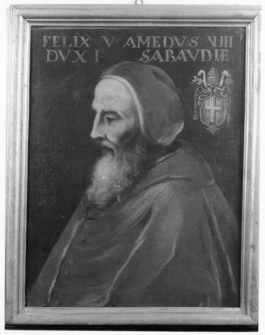 - NOTIZIE STORICO CRITICHE Il dipinto rappresentante Felice V, antipapa eletto a Basilea nel 1439 e deposto nel 1449, al secolo Amedeo VIII (1383-1459), primo duca di Savoia, (J.N. D. Kelly, Vite dei Papi, Casale Monferrato, 1989, pp. 410-411). La tela doveva originariamente fare parte della serie degli antipapi che, unitamente ad alcune effigi di pontefici, giunse alla sede attuale solamente nel 1923; l'esemplare in esame, invece, data l'appartenenza del personaggio alla dinastia sabauda, dovette essere inviato alla Basilica con la maggior parte della raccolta, frutto dell'accorpamento di più serie, documentate nel XVIII secolo tra Rivoli e Venaria, nel 1820, come attesterebbero anche alcune menzioni encomiastiche della guidistica ottocentesca, ed inizialmente collocato nelle stanze destinate ai sovrani al piano nobile nella manica sud. Nel settimo decennio del secolo, in occasione dei primi tentativi di riallestimento delle sale al primo piano ed al piano terreno per ospitare l'Appartamento reale ed altri ambienti di rappresentanza, i dipinti vennero trasferiti nel Refettorio, mentre l'esemplare in esame, fu, almeno dagli anni novanta, appeso alla balaustra della sala n. 3, unitamente ai ritratti, di diverso formato, di Maurizio di Savoia e degli otto cardinali legati da significati rapporti con la corte sabauda, Tutti a Superga ricordi e impressioni di un visitatore, Torino, 1894, p. 37; L. Selvaggi, La Biblioteca di Superga, in "Accademie e Biblioteche d'Italia", n. 32, Roma, 1982, p. 238. Riguardo ad una possibile attribuzione, si ricordi che nelle schede Vesme, alla voce, Giovanni Battista Grassi (Baudi di Vesme A., L'arte in Piemonte, Torino, 1966, vol. II, p. 540), figura nel 1717 un grosso pagamento da parte della corte per aver "raccomodato n. 169 quadri vecchi di ritratti di sommi pontefici" e "per altri 118 quadri dè sommi pontefici fatti novi", tutti destinati al castello di Rivoli. Da un punto di vista stilistico e tipologico, la tela presenta notevoli analogie sia con i ritratti realizzati da Cristofano dell'Altissimo per la collezione gioviana degli Uffizi a Firenze (Berti L., Uffizi Catalogo Generale, Firenze, 1978, pp. 605-660) che con la collezione dei ritratti dei pontefici e degli antipapi conservata nel palazzo Altieri di Oriolo Romano, realizzata per volere di Clemente X nella seconda metà del XVII secolo (Schiavo A., Le Palais Altieri, Roma, 1962, pp. 200-201; V. Pierotti, La "Galleria Altieri di Oriolo", Raccolta completa di quadri raffiguranti i Papi della storia da San Pietro a Giovanni XXIII)