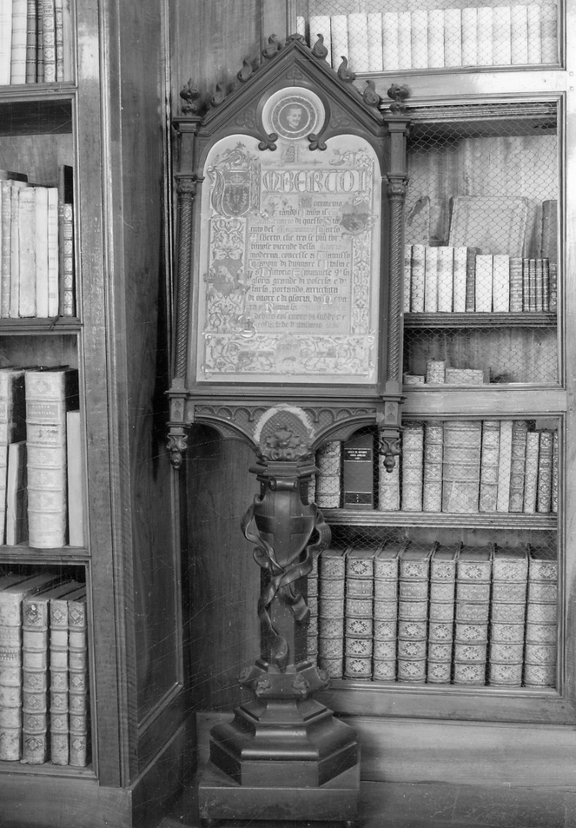 - NOTIZIE STORICO CRITICHE L'assenza di etichette inventariali e di precisi riscontri documentari non ha permesso di precisare se si tratti di un arredo proveniente da altra residenza sabauda, secondo una prassi che fu ripetutamente utilizzata per ammobiliare la sede in esame, o se, sin dall'origine, esso facesse parte del patrimonio in dotazione del palazzo attiguo alla Basilica di Superga. Numerosi sono i doni alla coppia reale di Umberto e Margherita di Savoia conservati a tutt'oggi presso la Biblioteca ed essi appaiono inseriti in un più vasto fenomeno, caratteristico degli ultimi decenni dell'Ottocento, di omaggi indirizzati ai sovrani in particolari ricorrenze e legati, sopratutto, alla produzione di manifatture locali e delle recenti scuole professionali di gusto eclettico, come attestano anche alcuni esemplari riprodotti nell'Illustrazione Italiana del 1893, A. Ghidoli, Le visite imperiali del 1888 e del 1893 nelle Cronache del tempo, in L. Morozzi (a curadi), Il catalogo delle opere d'arte del Quirinale, 1 Gli Appartamenti Imperiali nella manica lunga, Roma, 1998, pp. 105-106. L'esemplare in esame, commemorativo della concessione dello Statuto da parte di Carlo Alberto nel 1848, rivela, da un punto di vista stilistico, una tendenza ampiamente documentata per tutto l'Ottocento, ovvero la ripresa di stilemi ritenuti di età basso medievale, che viene definita "Neogotico". Tale gusto si afferma in Piemonte con Carlo Alberto, come testimoniano le committenze per arredi e dipinti conservati nelle residenze sabaude ed in particolare il riallestimento del castello di Pollenzo e di alcuni ambienti di Racconigi, quali gli arredi per il Reposoir della Regina nella Margheria, che presentano molte similitudini con l'opera in esame, R. Antonetto, Gabriele Capello "Moncalvo". Ebanista di due re, Torino, 2004, figg. 30-37. Godette di ulteriore fortuna anche in età umbertina - si pensi, a titolo di esempio, per citare un episodio al di fuori del Piemonte, all'allestimento della sala Bresciana, ideata dall'architetto Antonio Tagliaferri per l'Esposizione Italiana del 1881 a Milano - sebbene venato di nuovi interessi storicistici, influenzati da quegli studi storico-artistici che porteranno alla realizzazione del Borgo Medievale per l'Esposizione tenutasi in Torino nel 1898, F. Corrado, P. San Martino, Stramucci, Cussetti, Dellera e la Real Palazzina di Margherita di Savoia a Gressoney (1899-1907), in "Studi Piemontesi", Torino, 1995, vol. XXIV, fasc. 1, pp. 131-136