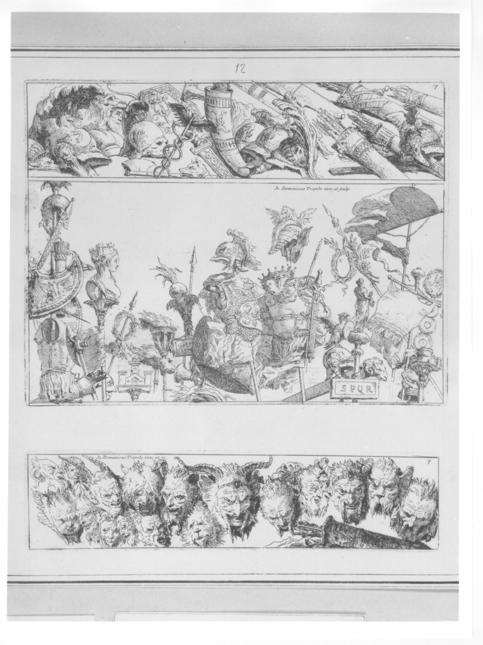 - NOTIZIE STORICO CRITICHE L'acquaforte, raffigurante uno studio di armature ed insegne romane, è incisa sul medesimo foglio in cui si trova la stampa seguente e presenta nel secondo riquadro, su una tavoletta fissata ad un'asta, la data 1774.Dalle annotazioni sugli inventari della Pinacoteca risulta che l'incisione, proveniente dalla collezione Gandolfi di Bologna, fu donata al museo da Giovanni Vico nel 1885. La stampa è ancora conservata nell'Album 32 (Stampe di scuola veneziana H / 3), foglio 12, secondo l'ordinamento dato alla raccolta delle incisioni della Galleria Sabauda da Francesco Gamba nel 1885