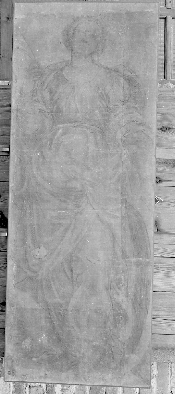 - NOTIZIE STORICO CRITICHE Le vicende dei cartoni dell'Accademia Albertina sono state ricostruite da Pierluigi Gaglia (in Romano G., 1982, pp. 26-33). Non si conosce la data di ingresso del cartone nelle collezioni sabaude; si può solo provare una sua presenza nella Regia Galleria anteriore al periodo napoleonico. Non si hanno notizie circa il prelevamento di cartoni da parte della commisione francese incaricata di esportare le opere d'arte. Trasferito nei Regi Archivi di Corte verosimilmente dopo il 1814 (anno del ritorno dei Savoia), il cartone fu donato da re Carlo Alberto all'Accademia Albertina il 13 aprile 1832, insieme ad altri 53 cartoni. Collocato provvisoriamente in Palazzo Madama, raggiunse l'attuale edificio dell'Accademia nel 1837. Nell'elenco steso dal Gran Ciambellano Carlo Emanuele Alfieri di Sostegno al momento della donazione, il cartone veniva assegnato a Gaudenzio Ferrari col numero d'inventario 13, visibile stampato ad inchiostro in basso a destra (Bollea L. C., 1932, p.491). Tale attribuzione, accettata da N. Gabrielli (1933, pp. 154, 197), è stata respinta da G. Romano (in Romano G., 1982, pp. 268-270), che, su suggerimento di Giovanni Testori, ha riferito alla bottega dei fratelli D'Enrico il nostro cartone e il compagno raffigurante santa Lucia, anch'esso in Accademia Albertina (n. 318, NCTN: 00209729). Lo studioso ha individuato le affinità stilistiche che legano il cartone alle quattro tele di Tanzio da Varallo nel Museo del Paesaggio di Pallanza, e ai relativi disegni preparatori collocati nella Pinacoteca di Varallo (Baiocco S., 2000, pp. 177-180, nn. 45-48). La maestosità e il fluente panneggio della santa del cartone si avvicinano al san Giovanni e alle sante Caterina e Apollonia di Pallanza che, all'epoca della mostra del 1982, si ritenevano eseguite intorno al 1630. Francesco Frangi (1999, pp. 134-135, 138-139) e, successivamente, Silvia Colombo (in Bona Castellotti M., 2000, p. 92, n. 10) hanno dimostrato come la realizzazione delle quattro tele di Pallanza si collochi tra il novembre 1616 e il gennaio 1618, fornendo indirettamente un nuovo appiglio alla datazione del nostro cartone, nuovamente accostato alle tele in un recente intervento di Simone Baiocco (2000, pp. 172-173)