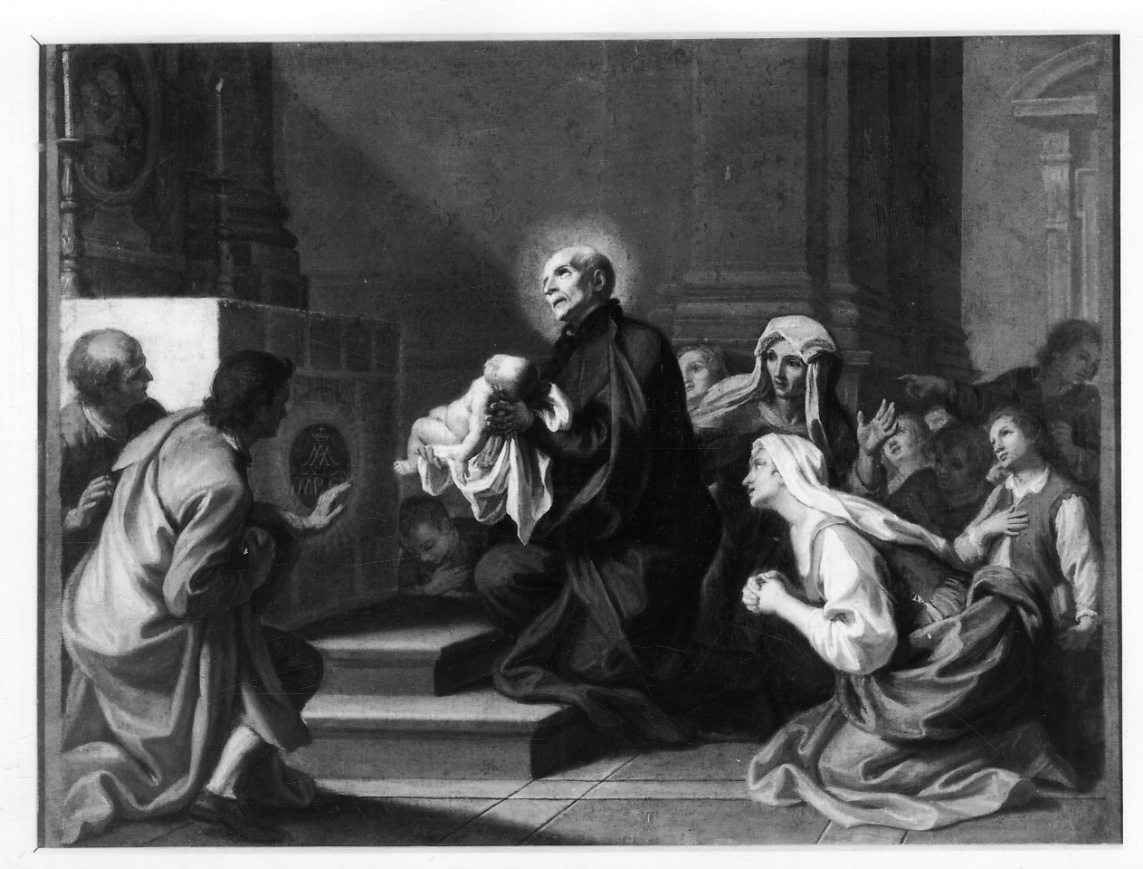 All'interno di una chiesa, di fronte all'altare raffigurato in scorcio, sul quale è esposto un dipinto ovale raffigurante una Madonna con Bambino, san Filippo Neri è inginocchiato e presenta un bambino, dietro di lui due figure femminili dal capo coperto sono anch'esse in preghiera, mentre un gruppo di fanciulli, osservano. In primo piano due figure maschili inginocchiate assistono alla scena