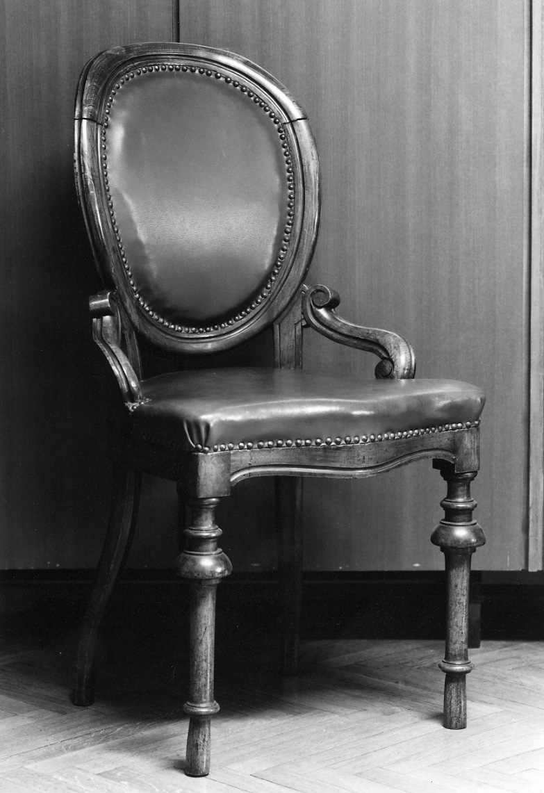 Schienale ovale con fascia interna modinata, imbottito, parimenti alla seduta, sagomata sulla fronte; entrambi sono rivestiti in pelle di colore marrone profilata da borchie dorate in metallo. Due montanti, in prossimità dello schienale, diritti raccordati alla seduta da due elementi a ricciolo. Fascia liscia, sagomata e percorsa da nervatura sulla fronte. Quattro sostegni, due posteriori a sciabola e due anteriori, diritti con grosso nodo a cipolla nella parte superiore sormontato da collarino che figura anche nella parte terminale del sostegno, in prossimità del piede