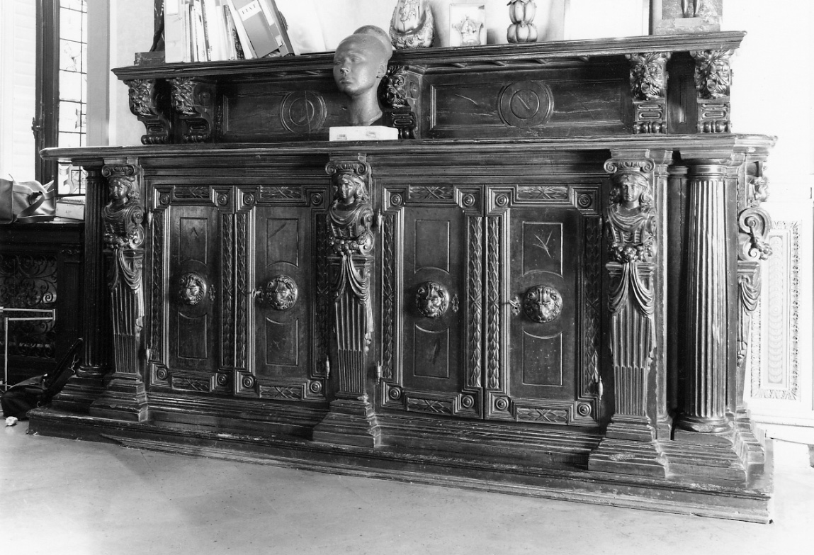 - NOTIZIE STORICO CRITICHE La credenza fa parte della serie di arredi che vennero acquistati, con delibera del luglio 1940, dalla Provincia di Torino a seguito dell'acquisizione di Palazzo Dal Pozzo della Cisterna, fino a tale data proprietà di Casa Savoia-Aosta. Nell'elenco topografico è indicata una "grande credenza" che potrebbe riconoscersi nell'esemplare in esame, stimata per L. 4000 e collocata nella "Camera da pranzo". Si tratta di uno dei pochi arredi che non andarono venduti durante le numerose tornate d'asta che, nella prima metà del Novecento, portarono alla dispersione della mobilia originale del palazzo, benché non più collocato nell'ambientazione originale, come dimostrato da alcune fotografie d'epoca, pubblicate nel catalogo d'asta edito nel 1932 dalla Galleria Dante Giacomini, ove si individuano mobili simili a quello in esame sia per tipologia che per decorazione, Catalogo delle collezioni private d'arte appartenute a S.A.R. Emanuele Filiberto di Savoia Duca d'Aosta, Galleria Dante Giacomini, Roma, 1932, tav. IV. La credenza, infatti, fa parte della serie di arredi commissionati dal duca en suite con la decorazione in stile neorinascimentale da lui voluta che trasformò il volto del palazzo settecentesco. In alternativa alla preferenza accordata alla cultura figurativa del XV/XVI secolo, compaiono, spesso, specie per mobili destinati a sale da pranzo o biblioteche, secondo una precisa codificazione tardo ottocentesca, imitazioni di elementi di arredo risalenti alla seconda metà del Seicento, che si inseriscono nell'ambito della caratteristica inclinazione della cultura ottocentesca al recupero degli stili storici, spesso connessi, nelle varie aree regionali, al richiamo di un passato glorioso. La tipologia della credenza in esame, infatti, rimanda proprio ad esemplari documentati in ambito lombardo nella seconda metà del Seicento, si vedano, per un confronto, alcuni esemplari conservati presso il Museo di Arti Applicate del Castello Sforzesco di Milano, E. Colle, Museo d'Arti applicate, mobili e intagli lignei, Milano, 1996, pp. 39-41, nn. 7,8. Pur non essendo state reperite precise note di pagamento che documentino la commissione degli arredi, coordinati, naturalmente, anche ad esemplari reperiti sul mercato antiquario, è noto da una guida commerciale della città di Torino che due studi fossero interessati, in quegli anni, da committenze da parte di Casa Savoia-Aosta, ovvero, quello di Carlo Albertoni e quello di Giuseppe Anguissola; inoltre, da un annuncio pubblicitario dei fratelli Mora di Milano risulta che anche i famosi mobilieri lombardi fossero tra i fornitori della famiglia ducale, Augusta Taurinorum. Torino illustrata nelle sue cose e nei suoi cittadini, Torino s.d. [ma 1902], pp. 256-258; E. Colle, Museo d'Arti applicate, mobili e intagli lignei, Milano, 1996, pp. 26-28