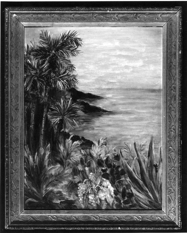In primo piano, sulla sinistra, svettano alcune palme, mentre al centro è posta una lussureggiante vegetazione marina con cespugli, fiori ed agavi sulla sinistra. Sullo sfondo, a sinistra, il profilo sinuoso della costa ed a destra il mare che assume toni rossastri del sole al tramonto che vi si rispecchia. La tela è posta entro cornice in legno dorato di forma rettangolare. Luce rettangolare; battuta liscia. Forma a cassetta; fascia interna modinata; fascia intermedia con motivo stilizzato a tralci di vite con pampini e grappoli d'uva; fascia esterna con ornato continuo a piccole foglie