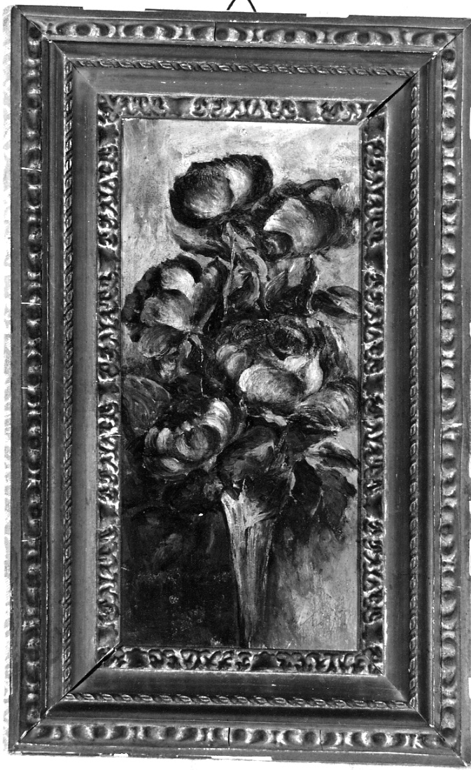 Un mazzo di rose dal colore porpora con sfumature rosa, per lo più ampiamente fiorite, domina la composizione. I fiori, resi con vigorose pennellate, sono posti entro un vaso dallo stelo stretto che potrebbe essere di vetro. Fondo reso a larghe pennellate con effetto di ombra in basso a sinistra. La tavoletta è posta entro cornice di profilo e luce rettangolare. Battuta liscia; interamente dorata. Tipologia a gola. Fascia interna con motivi continui a foglie stilizzate. Fascia centrale liscia interrotta da profilatura a piccole foglie ovali. Fascia esterna con baccellatura. Sul retro, in alto, gancio triangolare in metallo per sospensione