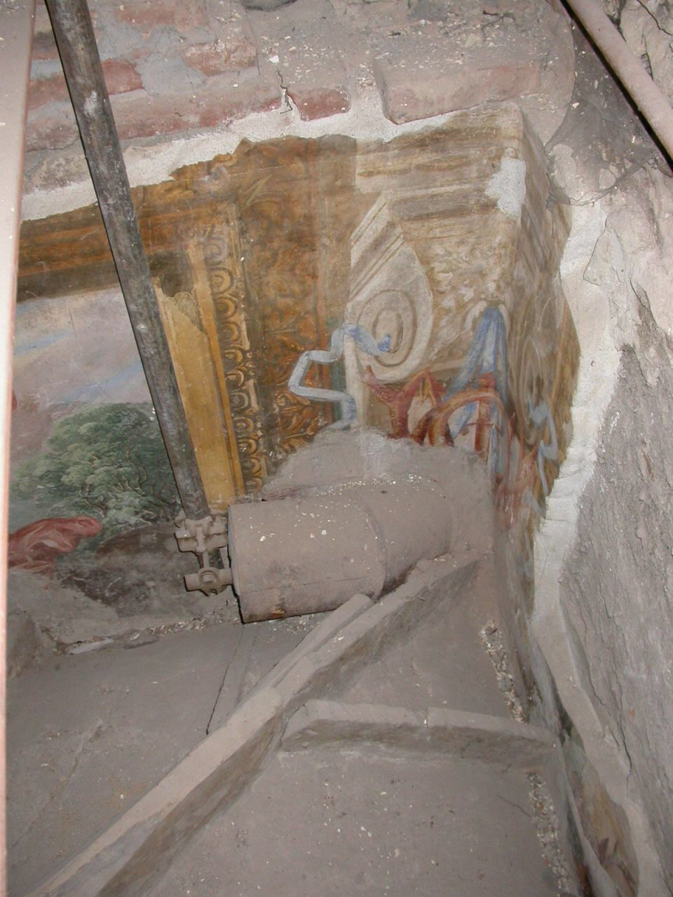 La decorazione, collocata al di sopra dell'attuale volta dell'ambiente, fa parte di un complesso di opere, al piano nobile ed al secondo piano, emerse nel corso degli interventi provvisionali eseguiti contestualmente al cantiere di restauro a partire dal 1990, come tempestivamente segnalato da Costanza Roggero Bardelli (cfr. C. Roggero Bardelli, Torino. La Vigna del Cardinal Maurizio di Savoia, in C. Roggero Bardelli, M.G. Vinardi e V. Defabiani, Ville Sabaude: Piemonte 2, Milano 1990, n. 23, p. 179). L'opera è una significativa testimonianza della fase decorativa seicentesca della Villa, di cui già Augusto Pedrini segnalava l'importanza, richiamando l'attenzione sui lacerti di affresco riemersi in seguito ai bombardamenti del luglio-agosto 1943: "... dal groviglio di travi bruciate e contorte [emergevano] fregi dipinti con soggetti di caccia e paesaggi."(cfr. A. Pedrini, Sul Palazzo Chiablese detto anche Villa Lodovica presso Villa della Regina, in <