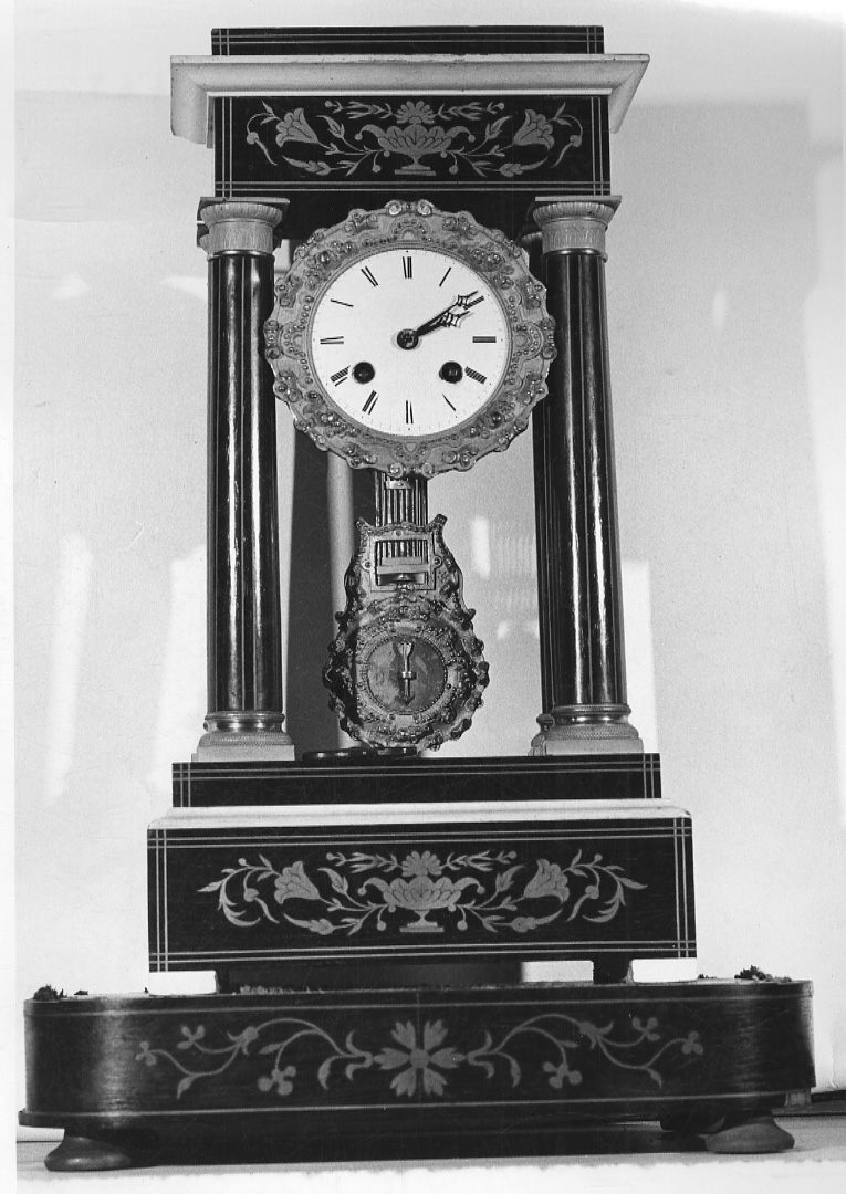 - NOTIZIE STORICO CRITICHE L'esemplare appartiene al tipo di produzione di serie in assoluto più ricorrente nella collezione sabauda. Esempi di orologi con la struttura dell'edicoletta dorica con basi, capitelli, ghiera del quadrante e pendolo metallici e cassa lignea intarsiata, si possono reperire in tutte le residenze, in particolar modo a Racconigi e negli uffici dell'amministrazione a Palazzo Reale (cfr., ad esempio, l'orologio nell'appartamento di madama Felicita a Palazzo Reale, in P. San Martino, in Orologi negli arredi del Palazzo Reale di Torino e delle residenze sabaude, a cura di G. Brusa, A. Griseri e S. Pinto, catalogo della mostra, Torino 1988, scheda. n. 136, p. 331)