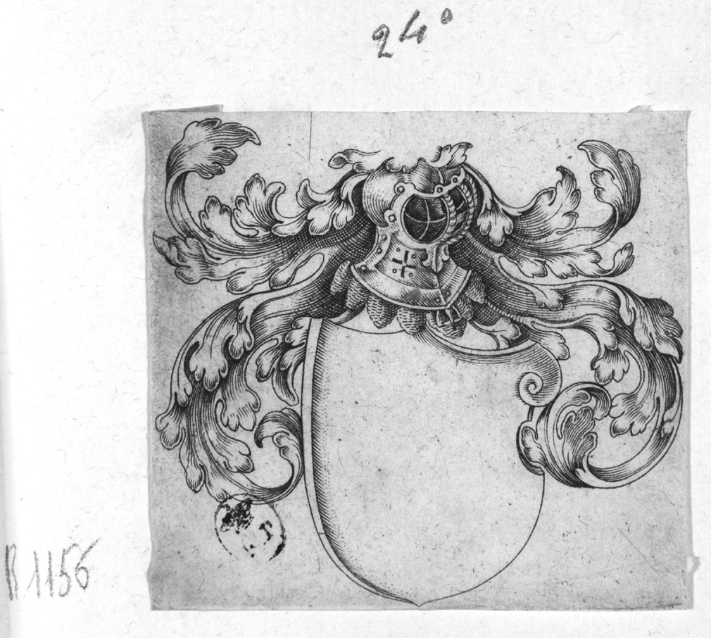 Araldica: studio per stemma. Decorazioni: motivi vegetali; cimiero