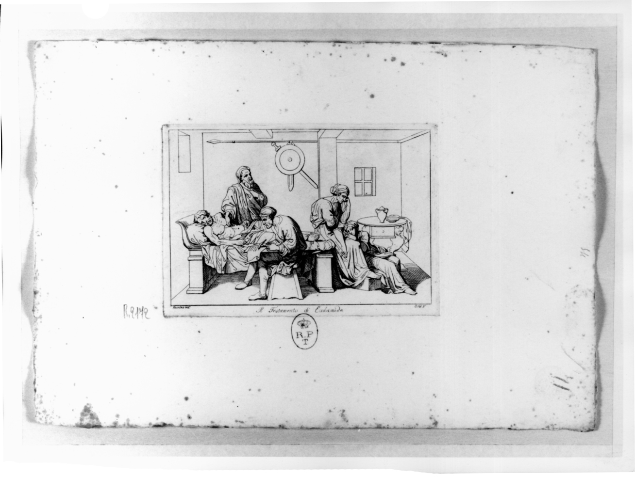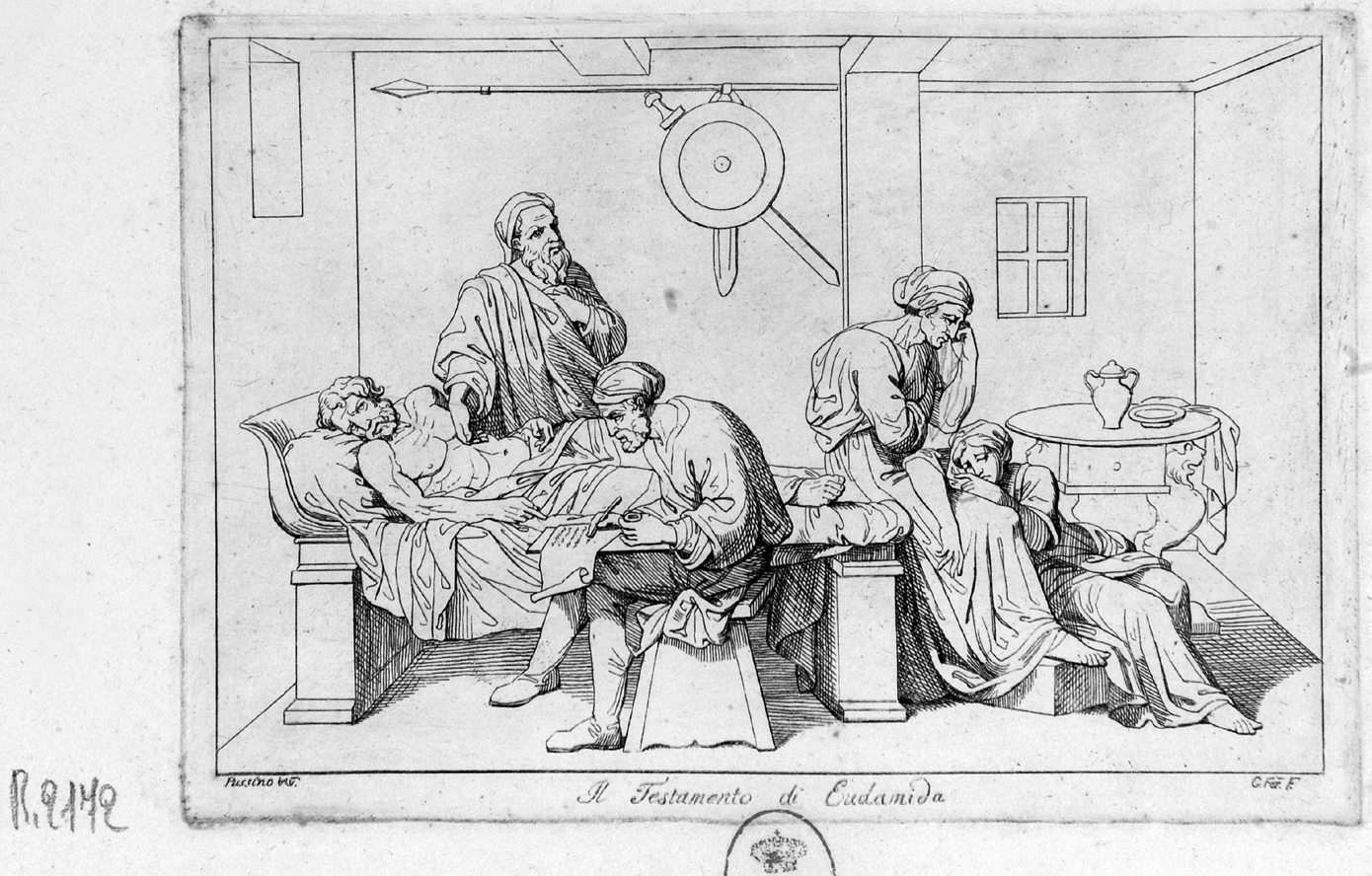 Personaggi: Eudamida. Attività umane: fare testamento. Figure: uomini, donna, bambino