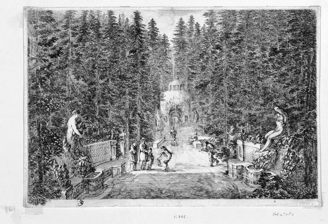 Veduta: villa di Pratolino, parco, bosco. Costruzioni: fontane da giardino. Figure: uomini, donne, bambini. Animali: cani. Piante: alberi. Sculture: statue da giardino