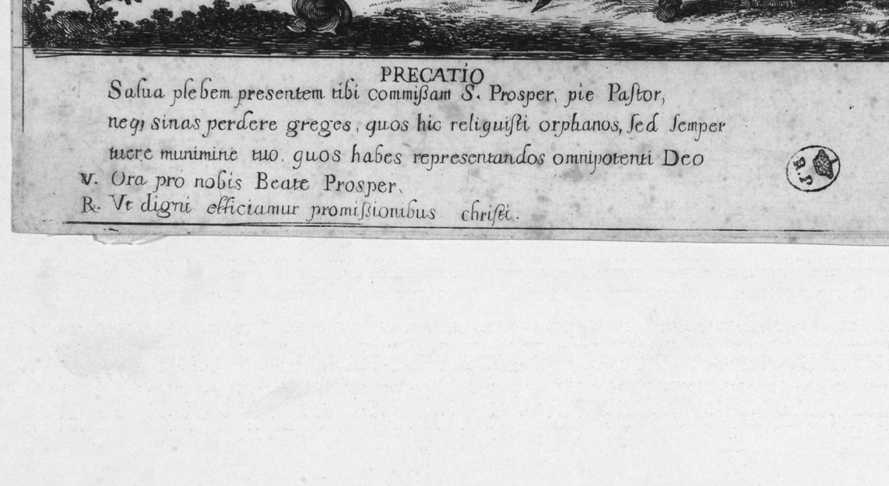 Veduta: Reggio Emilia. Personaggi: san Prospero. Fenomeni divini: miracolo. Attività umane: battaglia. Araldica: stemma (CALCAGNO)