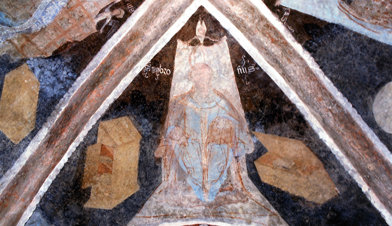 - ISCRIZIONI ai lati del volto di Sant'Ambrogio - s. ambro/ sius - caratteri gotici - a pennello nero - latino