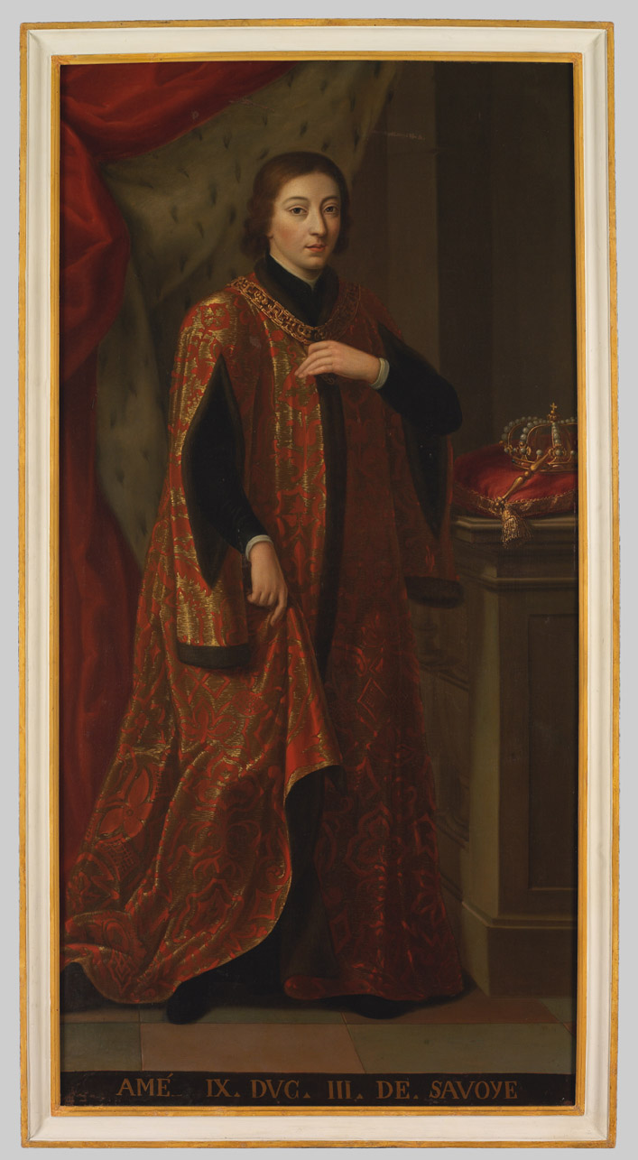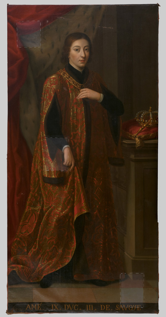 - NOTIZIE STORICO CRITICHE Il dipinto fa parte di un più ampio nucleo attualmente conservato presso il castello di Racconigi. La tela, uniforme per dimensioni alle altre della serie, raffigura Amedo IX. Legata agli altri dipinti dalla catena inventariale S.M., porta il numero S.M. 73, che trova corrispondenza nell 'inventario del 1879, in cui è registrata l'intera serie allora conservata al castello di Moncalieri, al primo piano, nella Galleria n. 70. In questo inventario la serie è composta da 87 quadri, documentati fin dai primi anni Settanta dell'Ottocento, da un altro inventario non datato, ma precedente al 1872, che li registra nella Galleria a ponente, dal numero 209 al 296: "Ottantasette quadri dipinti ad olio su tela rappresentante la Colezione (sic) dei R.li di Casa Savoja cioè da Beroldo a Maria Adelaide tutti con cornici colorite giallo Lunghezza 2,20 larghezza 1,18". Già nella prima metà dell'Ottocento Goffredo Casalis aveva avuto modo di visitare la "stupenda galleria, della lunghezza di centocinquanta passi; ai due lati della quale sono appesi i ritratti, in grandezza naturale, di tutti i Sovrani Sabaudi, ed accanto ad essi veggonsi pure le immagini delle loro Auguste Consorti". Tutti i quadri della serie, risultano, nell'inventario del 1879, scaricati nel gennaio del 1920, presso il castello di Racconigi, dove si trovano tuttora, ad eccezione di alcuni, non più presenti fin dagli anni Cinquanta del Novecento (non compaiono infatti nell'inventario del 1951). Il dipinto giunse dunque a Racconigi negli anni di Vittorio Emanuele III e della regina Elena: fin dall'inizio del secolo infatti i sovrani avevano intrapreso il "riordinamento del Reale Castello di Racconigi", poi continuato dal principe Umberto, come attesta l'acquisto già nel 1902, di alcuni "quadri antichi rappresentanti Principi e Principesse di Casa Savoia". Per quanto riguarda l'intera serie appare evidente che sia stata via via accresciuta con il trascorrere dei secoli, fino all'Ottocento. I ritratti, nella maggior parte dei casi, sono stati oggetto non solo di ripetuti restauri che li hanno interessati fino all'inizio del Novecento. Già Cesare Enrico Bertana, aveva individuato la presenza di una galleria di ritratti un tempo a Moncalieri, poi trasferita a Racconigi, non collegandola tuttavia a questa serie. Nuove ricerche hanno interessato una parte delle tele in questione in occasione della mostra tenutasi a Venaria (2007-2008), evidenziandone l'appartenenza alla galleria moncalierese sulla base di un elenco conservato presso la Biblioteca Reale, datato al 1780 (Misc. Patria, 46,24). Il documento riporta tuttavia solo i ritratti dei principi, da Beroldo a Carlo Emanuele III. Non vi compaiono invece le principesse, dato che induce a pensare per queste ultime a una provenienza da altre residenze. Il documento si riferisce probabilmente ai lavori necessari alla costituzione della galleria di ritratti voluta nell'ambito del generale rilancio del castello di Moncalieri, intrapreso da Vittorio Amedeo III, appena salito al trono (P. Astrua, 1987, p.88). Questo dipinto insieme a quelli di Cristina di Francia, Maria Giovanna Battista di Nemours, Francesco Giacinto, Carlo Emanuele II e Amedeo VIII viene infatti citato nel diario di Carlo Felice fra i ritratti realizzati da Giovanni Panelbo per la Galleria di Moncalieri tra il 1786 e il 1788. Il restauro appena concluso ha non solo confermato affinità di carattere tecnico e dei materiali fra questo ritratto e quello di Amedeo VIII, ma anche con i ritratti di Anna d'Orelans, Cristina Sulzbach, Polissena d'Assia, Elisabetta di Lorena e Francesca di Valois. L'iconografia di Amedeo IX segue tuttavia il modello dei sovrani incisi nei medaglioni dell'"Histoire Généalogique de la Royal Maison De Savoye" di Samuel Guichenon pubblicata a Lione nel 1660 (p. 547), già utilizzato per realizzare anche le effigi dei sovrani più antichi di questa stessa serie. Il dipinto è stato pubblicato da P. Manzoni nel volume "Epopea di Savoia..."(1930). Nel castello di Racconigi esiste una replica a mezzo busto di questo ritratto (R 5615)