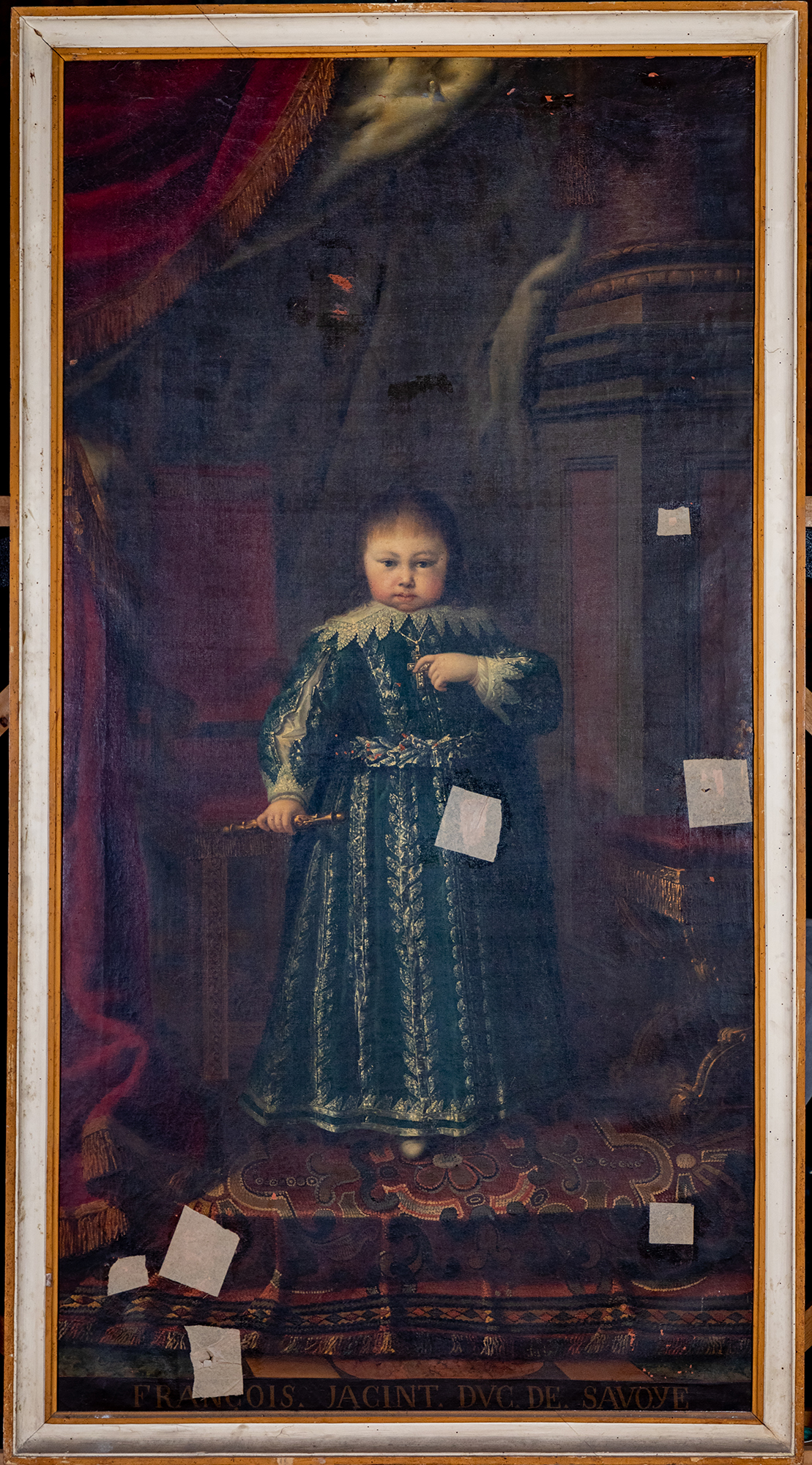 - NOTIZIE STORICO CRITICHE Il dipinto fa parte di un più ampio nucleo attualmente conservato presso il castello di Racconigi. La tela, uniforme per dimensioni alle altre della serie, raffigura Francesco Giacinto. Legata agli altri dipinti dalla catena inventariale S.M., porta il numero S.M. 94, che trova corrispondenza nell 'inventario del 1879, in cui è registrata l'intera serie allora conservata al castello di Moncalieri, al primo piano, nella Galleria n. 70. In questo inventario la serie è composta da 87 quadri, documentati fin dai primi anni Settanta dell'Ottocento, da un altro inventario non datato, ma precedente al 1872, che li registra nella Galleria a ponente, dal numero 209 al 296: "Ottantasette quadri dipinti ad olio su tela rappresentante la Colezione (sic) dei R.li di Casa Savoja cioè da Beroldo a Maria Adelaide tutti con cornici colorite giallo Lunghezza 2,20 larghezza 1,18". Già nella prima metà dell'Ottocento Goffredo Casalis aveva avuto modo di visitare la "stupenda galleria, della lunghezza di centocinquanta passi; ai due lati della quale sono appesi i ritratti, in grandezza naturale, di tutti i Sovrani Sabaudi, ed accanto ad essi veggonsi pure le immagini delle loro Auguste Consorti". Tutti i quadri della serie, risultano, nell'inventario del 1879, scaricati nel gennaio del 1920, presso il castello di Racconigi, dove si trovano tuttora, ad eccezione di alcuni, non più presenti fin dagli anni Cinquanta del Novecento (non compaiono infatti nell'inventario del 1951). Il dipinto giunse dunque a Racconigi negli anni di Vittorio Emanuele III e della regina Elena: fin dall'inizio del secolo infatti i sovrani avevano intrapreso il "riordinamento del Reale Castello di Racconigi", poi continuato dal principe Umberto, come attesta l'acquisto già nel 1902, di alcuni "quadri antichi rappresentanti Principi e Principesse di Casa Savoia". Per quanto riguarda l'intera serie appare evidente che sia stata via via accresciuta con il trascorrere dei secoli, fino all'Ottocento. I ritratti, nella maggior parte dei casi, sono stati oggetto non solo di ripetuti restauri che li hanno interessati fino all'inizio del Novecento. Già Cesare Enrico Bertana, aveva individuato la presenza di una galleria di ritratti un tempo a Moncalieri, poi trasferita a Racconigi, non collegandola tuttavia a questa serie. Nuove ricerche hanno interessato una parte delle tele in questione in occasione della mostra tenutasi a Venaria (2007-2008), evidenziandone l'appartenenza alla galleria moncalierese sulla base di un elenco conservato presso la Biblioteca Reale, datato al 1780 (Misc. Patria, 46,24). Il documento riporta tuttavia solo i ritratti dei principi, da Beroldo a Carlo Emanuele III. Non vi compaiono invece le principesse, dato che induce a pensare per queste ultime a una provenienza da altre residenze. Il documento si riferisce probabilmente ai lavori necessari alla costituzione della galleria di ritratti voluta nell'ambito del generale rilancio del castello di Moncalieri, intrapreso da Vittorio Amedeo III, appena salito al trono (P. Astrua, 1987, p.88). Questo dipinto insieme a quelli di Amedeo VIII, Amedeo IX, Cristina di Francia, Maria Giovanna Battista di Nemours, Carlo Emanuele II viene infatti citato nel diario di Carlo Felice fra i ritratti realizzati da Giovanni Panealbo per la Galleria di Moncalieri tra il 1786 e il 1788