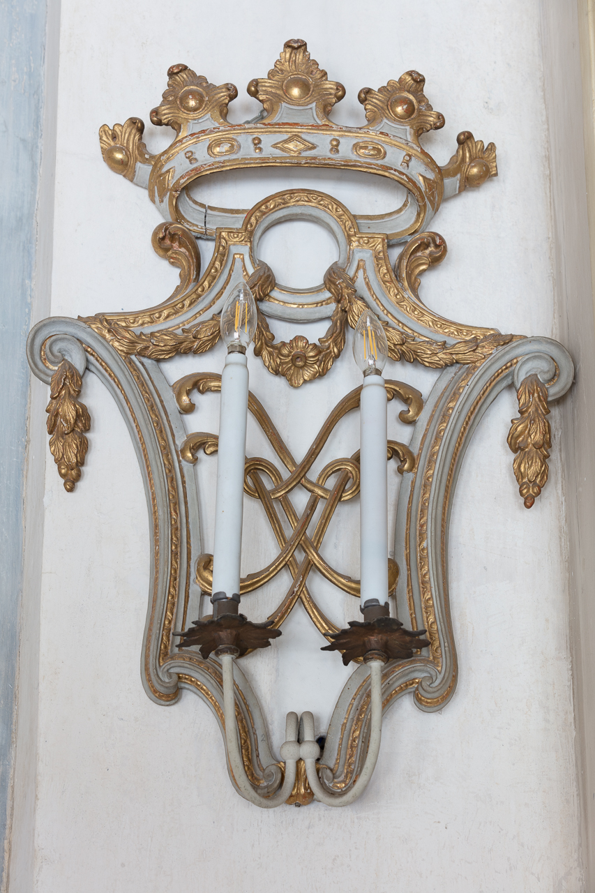 Ventola in legno intagliato, laccato e dorato adorno con festoni di fiori e foglie d'alloro sormontati da corona. Al centro monogramma. Dotata di due bracci in ferro con piattello in metallo dorato. Elettrificata