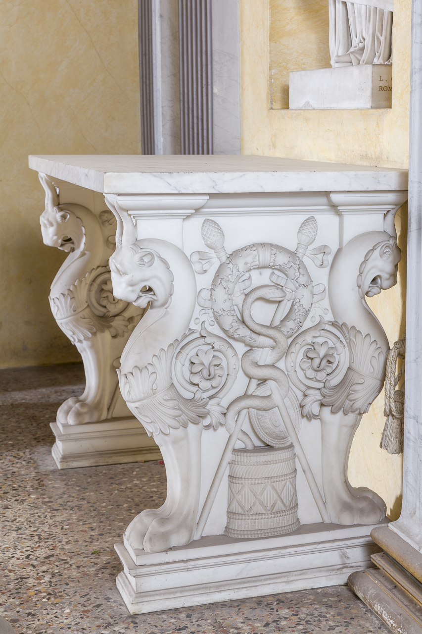 Tavolo a muro in marmo bianco con sostegni scolpiti raffiguranti grifoni e trofei con serpenti e ghirlande floreali
