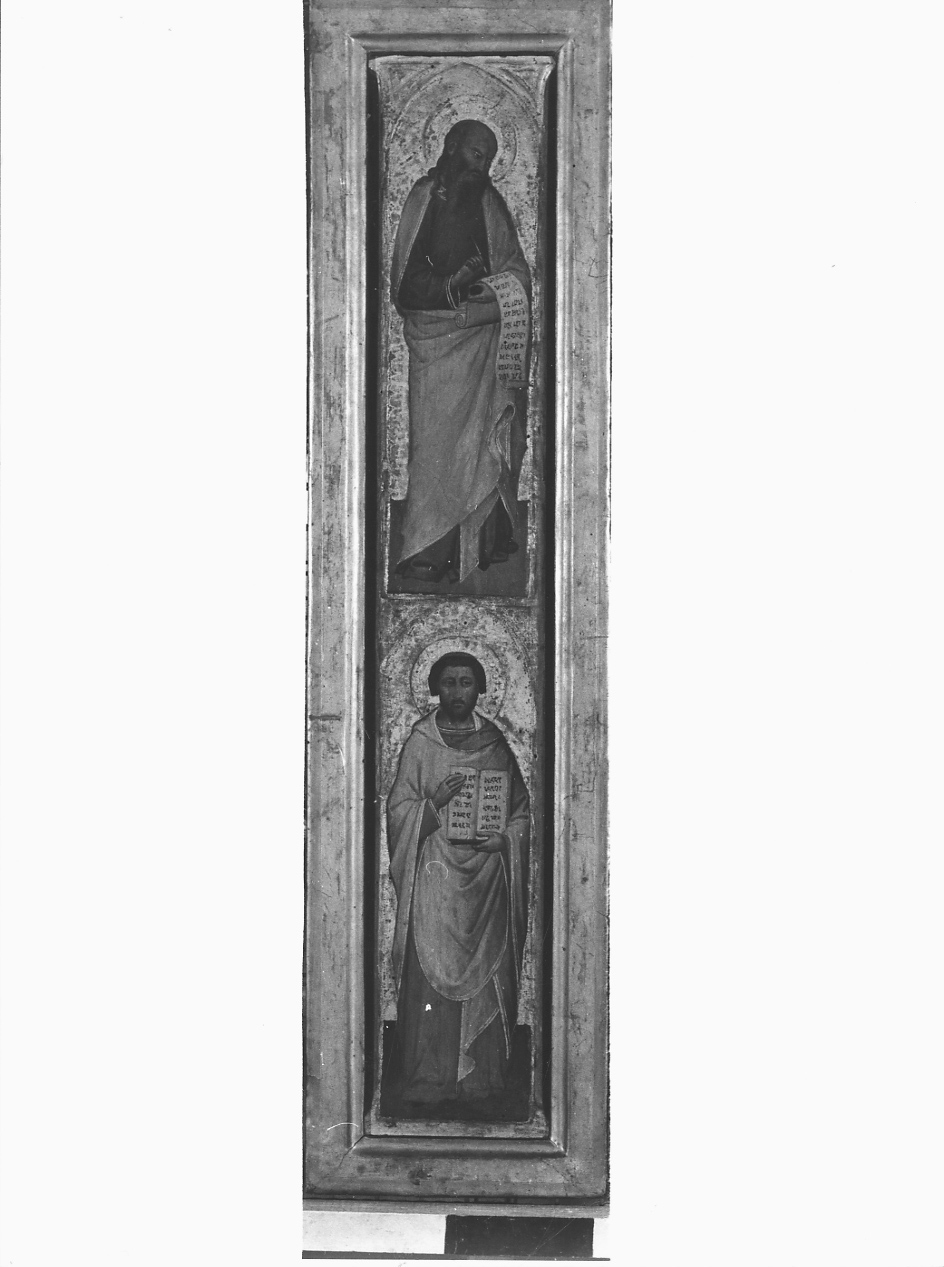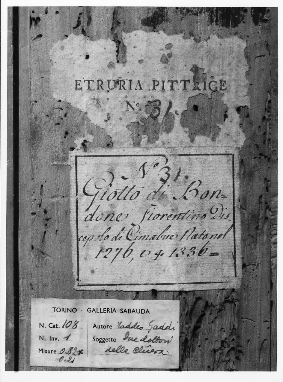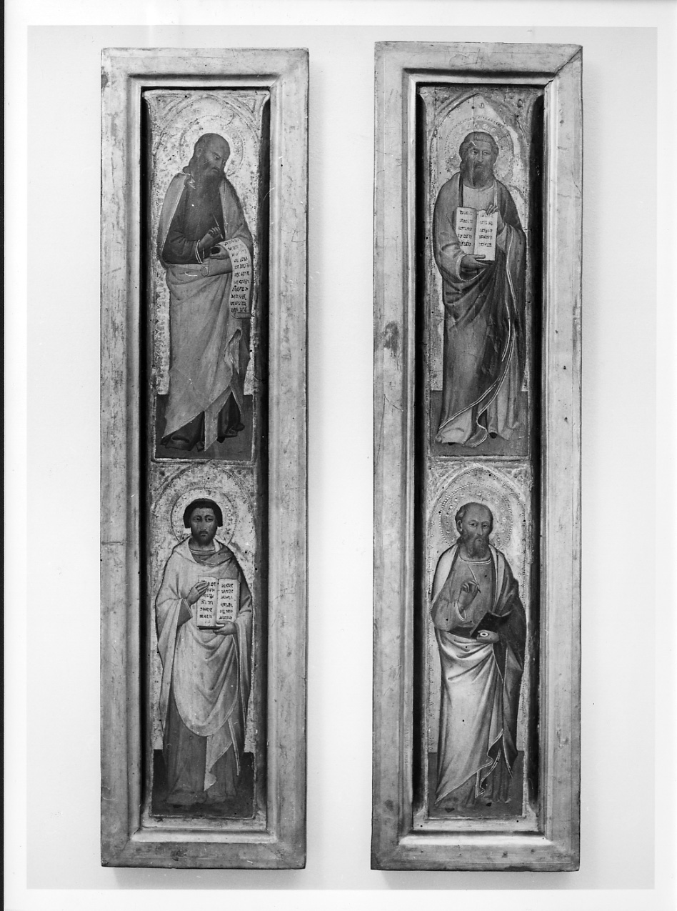 - NOTIZIE STORICO CRITICHE Con il suo pendant (inv. 1, cat. 108), l'opera pervenne nelle collezioni della Regia Pinacoteca Nazionale il 28 aprile 1864, all'interno del legato della marchesa Giulia Colbert, vedova del marchese Tancredi Falletti di Barolo, che aveva già espresso il desiderio di lasciare alla Pinacoteca parte della sua collezione. I due pannelli entrarono nella collezione Falletti probabilmente nel secondo o terzo decennio dell'Ottocento, quando si avevano ormai lasciato Parigi, dove prevalentemente vissero fino al 1815, e si erano trasferiti a Torino. Essi probabilmente acquistarono i due dipinti a Firenze, dove erano soliti trascorrere l'inverno ed erano molto conosciuti nell'ambiente collezionistico. Dall'osservazione del retro delle tavolette si è notato che il sigillo dei Falletti è stato sovrammesso all'iscrizione a vernice nera, che è quindi anch'essa da ritenersi precedente all'ingresso dell'opera nella quadreria del marchese Tancredi. L'iscrizione nel dipinto ora inv. 1 della Sabauda reca il riferimento a Giotto. I due pannelli recano a tergo anche due etichette: una con l'iscrizione "Etruria Pittrice" seguita da un numero e un'altra con lo stesso numero e l'attribuzione a Giotto di Bondone, che secondo Fabrizio Corrado (1995) potrebbero essere state apposte in occasione di un'esposizione antiquariale svoltasi sull'onda del successo del volume di Niccolò Pagni e Giuseppe Bardi 'L'Etruria Pittrice ovvero storia della pittura toscana dedotta dai suoi monumenti che si esibiscono in stampa dal secolo X fino al presente' edita a Firenze nel 1791. In realtà, come ha dimostrato Vincenzo Buonocore (2004), l'indicazione di "Etruria Pittrice" indica l'appartenenza dei dipinti alla collezione fiorentina omonima di Alfonso Tacoli-Canacci (1724-1801). Infatti risultano descritti nei cataloghi manoscritti del collezionista a partire da quello del 1789 conservato presso la Biblioteca Reale di Madrid, in cui si indica: "14-15. Due piccoli quadri in forma di pilastri con fondo d'oro in ogn'uno dei quali sono rappresentati due Evangelisti figure intiere in piedi.-Tavola- B. 1 - B. 1/3 - di Giotto suddetto". I dipinti sono poi menzionati nell'inventario successivo, databile al 1790-1792 (Soprintendenza per i Beni Artistici e Storici di Parma), come segue: "30-31. Tavole. Due piccoli quadri in forma di pilastri con fondo d'oro, in ogn'uno dei quali sono rappresentati due Evangelisti. Figure intiere in piedi. - B. 1 1/4 - B. 1/3. Di Giotto di Bondone - Di Cimabue - 1276. 1326 - 9". Infine sono compresi nel 'Catalogo Ragionato' stampato a Parma nel 1796 (conservato presso il Kunsthistorisches Institut di Firenze), con i nn. 384 e 385 e ancora l'attribuzione a Giotto con la quale presumibilmente passarono nella collezione Falletti di Barolo. Nella quadreria Falletti di Barolo le tavolette riferite a Giotto furono indicate con il numero 23 nell'inventario stilato da Massimo d'Azeglio, Luigi Gandolfi e Carlo Arpesani durante il sopralluogo effettuato a Palazzo Barolo tra febbraio e aprile 1864 per scegliere le opere per la Pinacoteca (Corrado 1995). Nell'inventario del 1866 sono date a Scuola fiorentina, mentre nello stesso anno compaiono nell''Indicazione sommaria' di Vico come opere di "Gaddi Taddeo Fiorentino", (e risultano esposte come opere "di prima scelta"; cfr. Corrado 1995, p. 156). Tale attribuzione è mantenuta nell'inventario Gamba del 1871, da Gamba (1884), da Jacobsen sia pure con qualche dubbio sull'autografia (1897), da Vesme (1899) da Pacchioni (1932, 1938, 1951) e da Gabrielli (1959). Nel 1965 la Gabrielli le attribuiva dubitativamente a Jacopo Orcagna detto Jacopo di Cione, a cui le dava per certo nel 1971, indicando che "un tempo le due tavolette erano riunite in un'unica cornice". Invece nel 1975 Boskovits attribuiva i quattro Evangelisti della Sabauda ad Ambrogio di Baldese, datandoli tra il 1375 e il 1380, quando l'artista, fedele seguace dei Cioni, era poco più che ventenne. Lo studioso ne indica l'appartenenza allo stesso complesso di cui facevano parte le tempere già della collezione Kleinberger di New York, raffiguranti i santi Lorenzo, Giovanni Battista, Antonio abate e un santo vescovo (cm 30 x 13 ognuna; Boskovits 1975, p. 275, fig. 360). Ma nel 1990 lo stesso Boskovits riteneva comunque ancora aperto il problema dell'attribuzione delle tavolette torinesi, considerando stavolta la possibilità di vedervi l'autore in Mariotto di Nardo, nel momento della sua probabile formazione nella bottega di Ambrogio di Baldese. Anche Sonia Chiodo (1999) concorda con l'attribuzione a Mariotto di Nardo giovane, sotto il cui nome è confluito gran parte del corpus di opere di Ambrogio di Baldese. In particolare i pannelli torinesi mostrano analogie significative, tipologiche e stilistiche, con i 'Profeti Isaia e Daniele' di Mariotto conservati presso la Galleria dell'Accademia di Firenze, databili nel 1375-1378