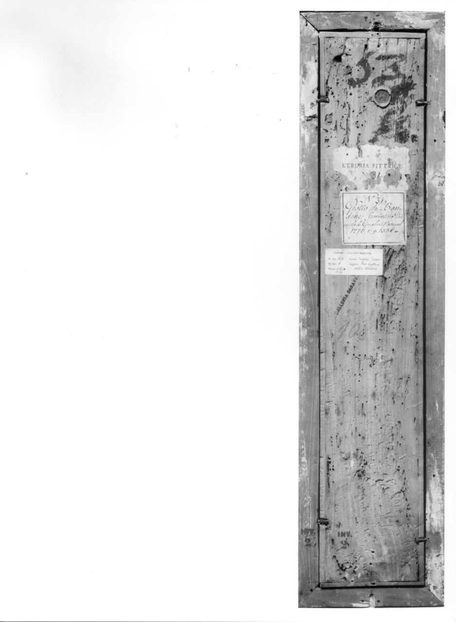 DIPINTO: a fondo d'oro con rilievi, punzonato; 1 asse verticale con bordatura di listelli inchiodati sui 4 lati; CORNICE: del XIX secolo; dorata con fasce lisce. Telaio con incastro angolare a 45°; inserimento del dipinto con chiodi in ferro a sezione quadrata che forano lateralmente l'asse di supporto