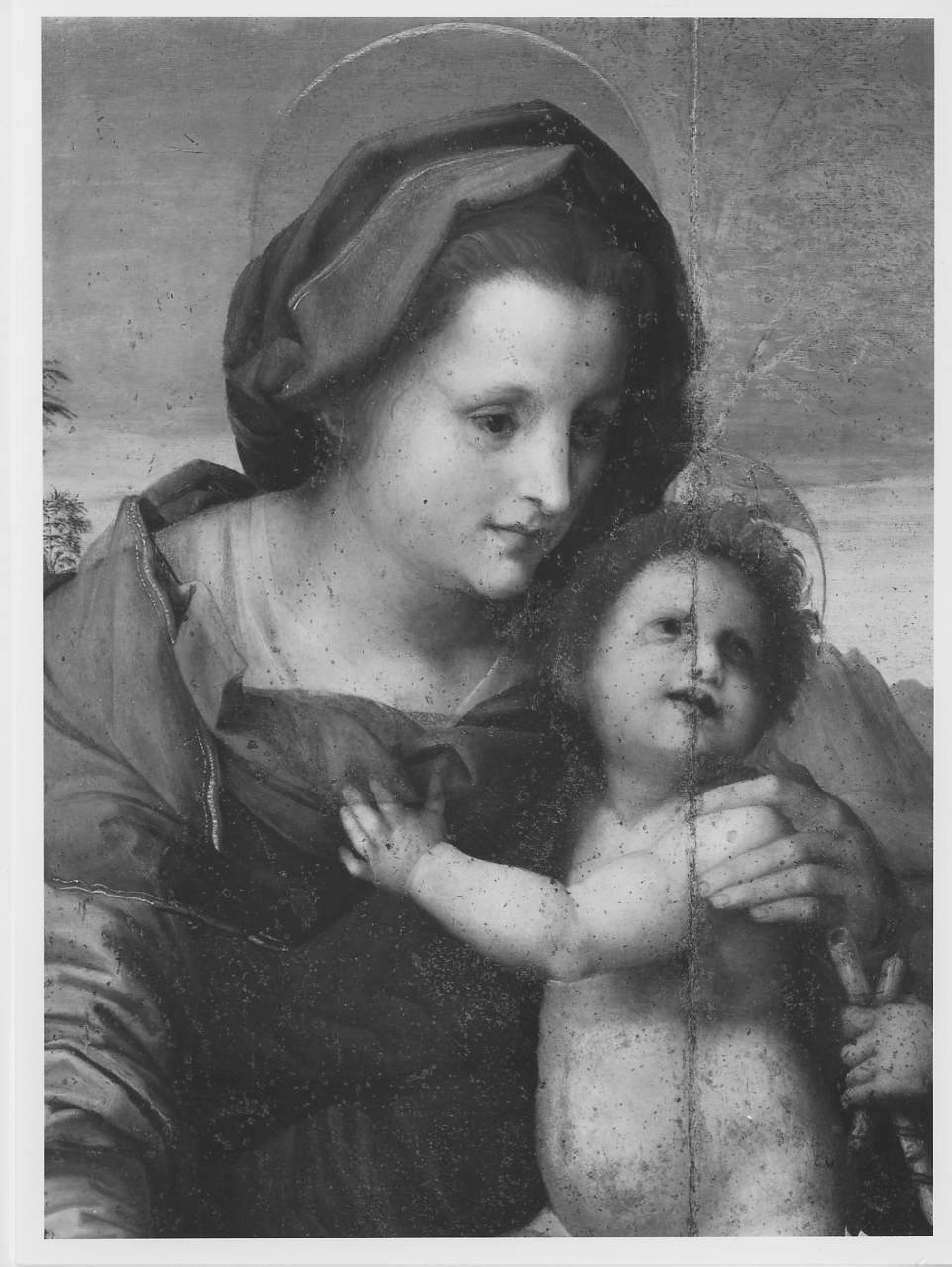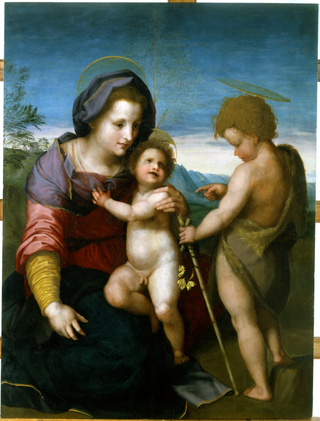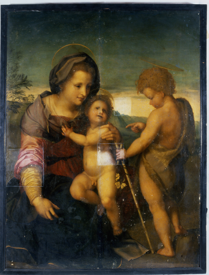 - NOTIZIE STORICO CRITICHE Il dipinto faceva parte della collezione Gabaldoni, acquistata da Vittorio Emanuele I e confluita quindi in Palazzo Durazzo e in seguito in Palazzo Reale a Genova. Da qui il quadro è stato trasferito da Roberto d'Azeglio per la Regia Galleria di Torino negli anni Trenta dell'Ottocento, come risulta dall'inventario del 1871 redatto da Luigi Gamba. Nel 1859 era esposto nella sala VII, con attribuzione ad Andrea Del Sarto, in quanto replica della 'Sacra Famiglia' del Louvre. Nel 1909 si trovava nella VI sala, come copia di discepolo di Andrea del Sarto, ed anche nel corso del Novecento rimase esposto con analoghi riferimenti. Nel catalogo pubblicato dalla Gabrielli nel 1971 si annota che si tratta probabilmente dell'opera venduta il 20 febbraio 1667 dall'incisore comasco Gaspare Mola al duca Carlo Emanuele II (N. Gabrielli, 1971, p. 224), notizia di cui però non si è trovato alcun riscontro. Come nota la stessa Gabrielli, l'opera è sempre stata riconosciuta come una "copia" del dipinto raffigurante la 'Madonna col Bambino, santa Elisabetta, san Giovannino e due angeli', oggi al Louvre (inv. 1515), realizzato verosimilmente per il re Francesco I di Francia intorno al 1515-1516. Esistono numerose derivazioni dell'invenzione sartesca, la più nota delle quali è quella alla Alte Pinakothek di Monaco di Baviera, riferibile allo stesso Andrea. Nella tavola di Torino il gruppo della Madonna col Bambino pare più prossimo alla versione di Monaco, mentre il San Giovannino in piedi di spalle sulla destra è una citazione dalla 'Madonna Corsini' a Petworth House (Lord Egremont Collection) databile intorno al 1513. Diversamente da tali modelli la composizione della sabauda è ambientata nel paesaggio. L'opera, che in occasione del recente restauro ha recuperato la sua leggibilità, risulta una buona replica riferibile alla bottega del maestro