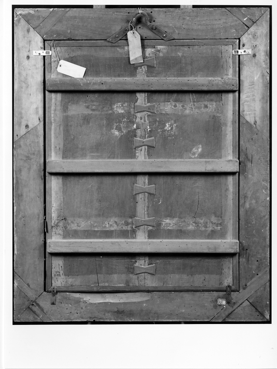 DIPINTO: due tavole in verticale, farfalle nella connessione al centro, tre traverse recenti orizzontali, traccie delle traverse antecedenti. CORNICE: intagliata, dorata, XIX secolo